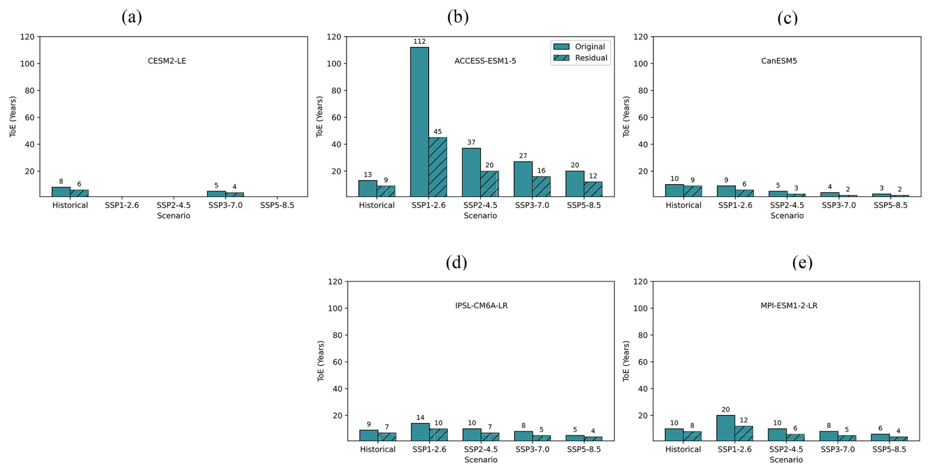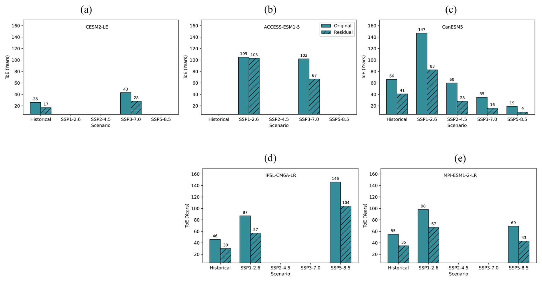 Figure 6ToE of NBP from historical simulations to future scenarios. Note that ToE in historical simulations is calculated with signal period of 1960–2009 relative to the noise period of 1930–1959, and ToE in future scenarios is calculated with signal period of 2020–2070 relative to the noise period of 2020–2070, details please check Sect. 2.4. The solid boxes represent the ToE of NBP, while the hatched boxes represent the ToE of the NBP residual with the circulation-induced variability removed. In cases where both boxes are missing, the respective signal is not available (no significance of linear trend slope), or the ToEs are longer than 150 years.