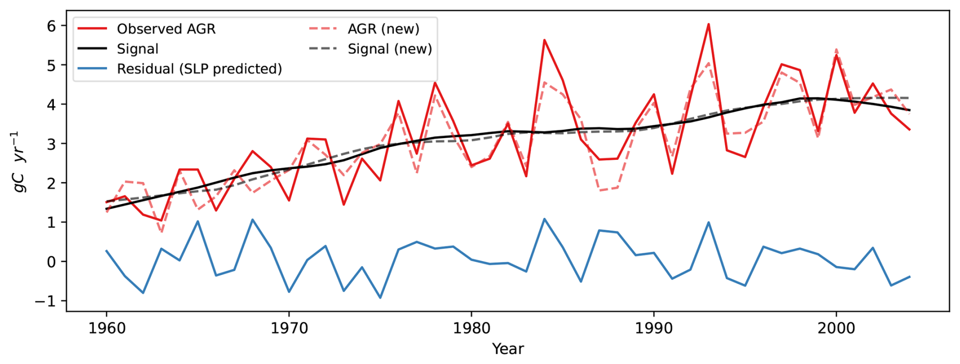 Figure 7Time series of the atmospheric CO2 growth rate (AGR) at Mauna Loa from 1960 to 2009 (Lan et al., 2025). Five volcanic years (1963, 1982, 1983, 1991, and 1992) are removed. The red line is the observed AGR. The black line is the long-term trend fitted with a locally weighted scatterplot smoothing (Cleveland et al., 1991, LOWESS) (signal). The residual (AGR minus fitted long-term trend) was predicted using SLP through ridge regression with leave-one-out cross validation (blue line). This SLP predicted residual is then subtracted from the observed AGR to obtain a new AGR time series with circulation-induced variations removed (observed AGR minus SLP predicted residual). The dashed black line is the new long-term trend. Data pretreatment and the ridge regression model follow paper Li et al. (2022). Note that the signal period is the same as in models (1960–2009). Due to limited records of CO2 observations before 1958, here we calculate the noise also in the period 1960–2009.
