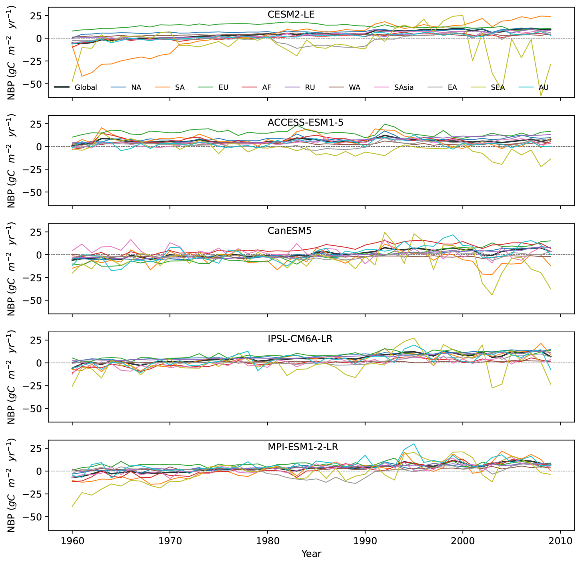 We then examine how long it takes for the anthropogenic signal (ensemble mean of each model) to emerge from year-to-year variations of NBP in global scale and across 10 RECCAP-2 regions (Fig. 2b). Globally, CESM2-LE has the shortest detection time at 26 years, while CanESM5 takes the longest at 66 years (Fig. 2b). The detection time in ACCESS-ESM1-5 is not available, due to a flat trend of ensemble mean after 1960s.
