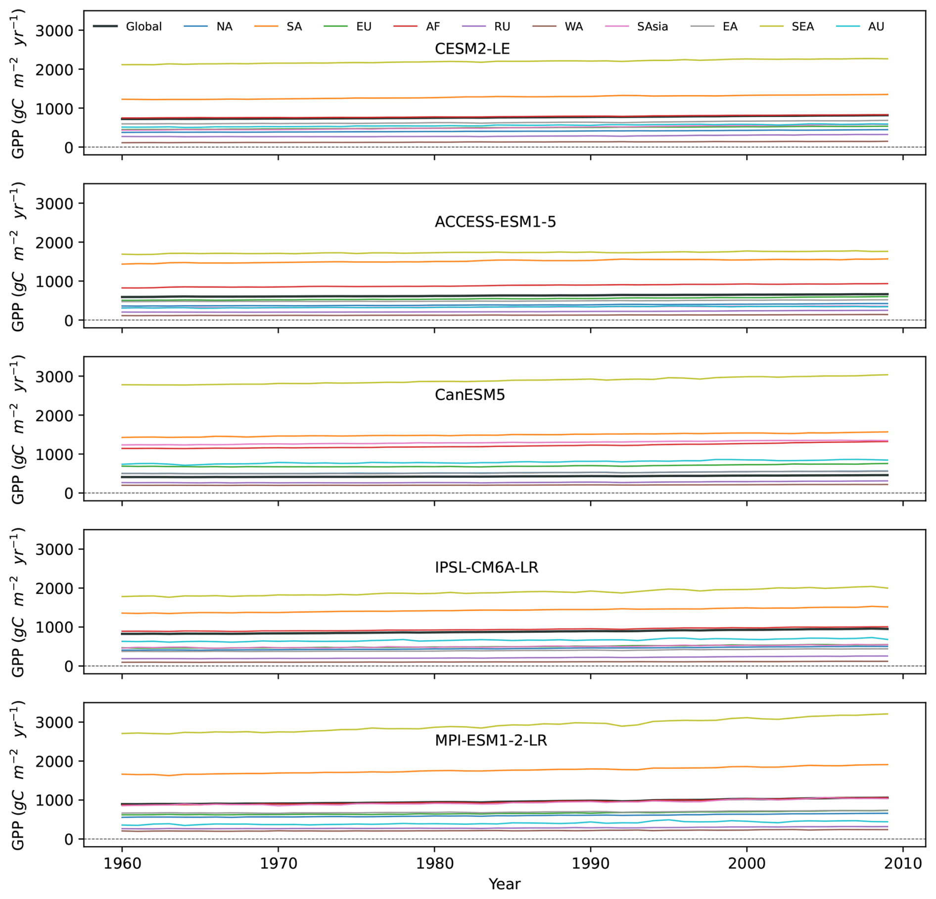 Figure A2Time series of GPP ensemble mean from five ESMs. The thick black line is the global ensemble mean, and the colored lines represent ensemble means for the 10 RECCAP-2 regions.