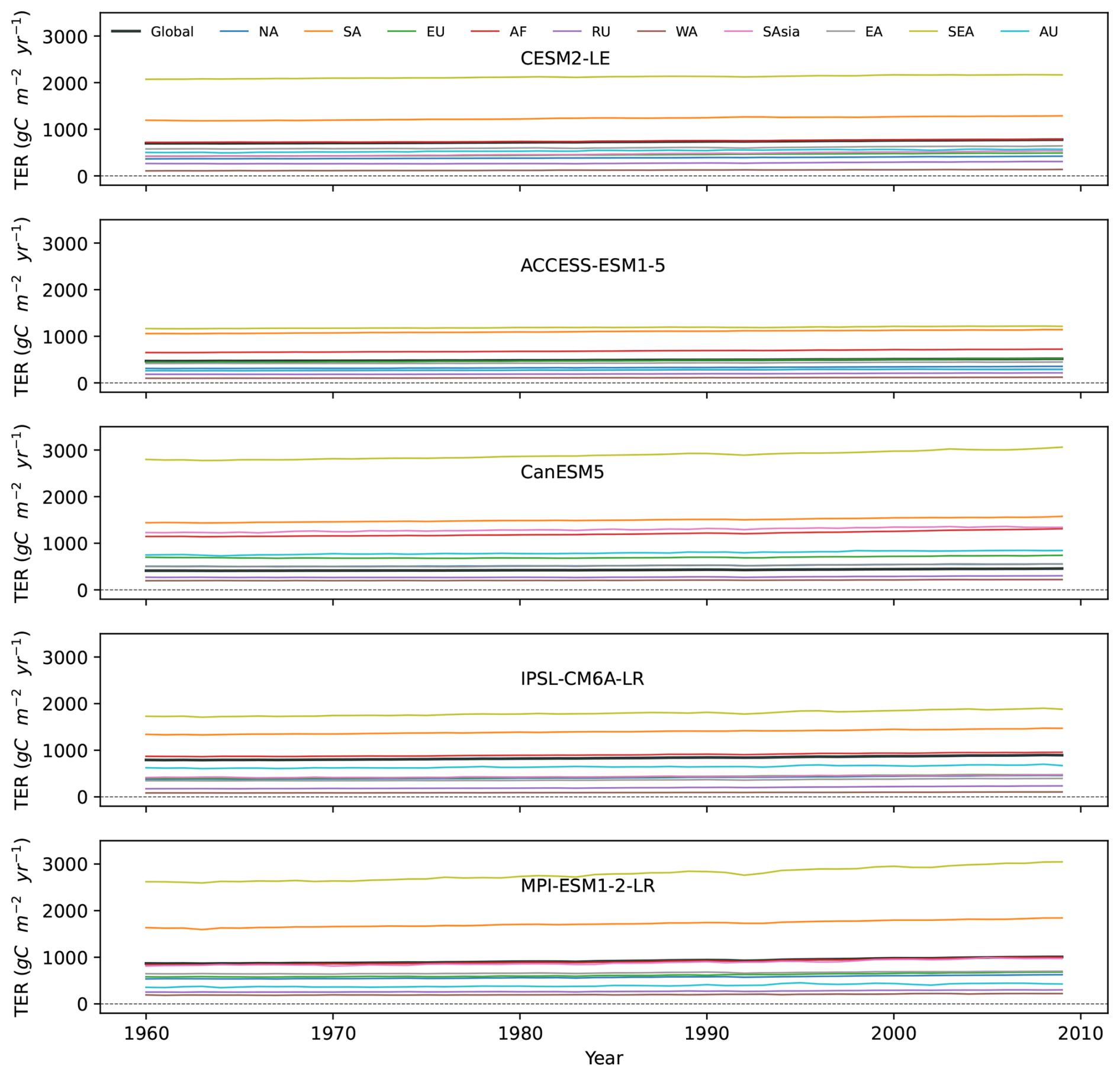 The TER in four CMIP6 models is calculated based on the sum of autotrophic (ra) and heterotrophic respiration (rh) (Eq. 2).