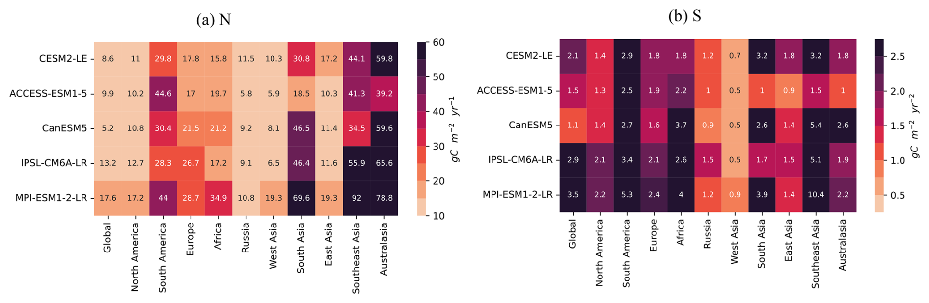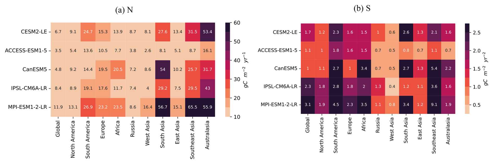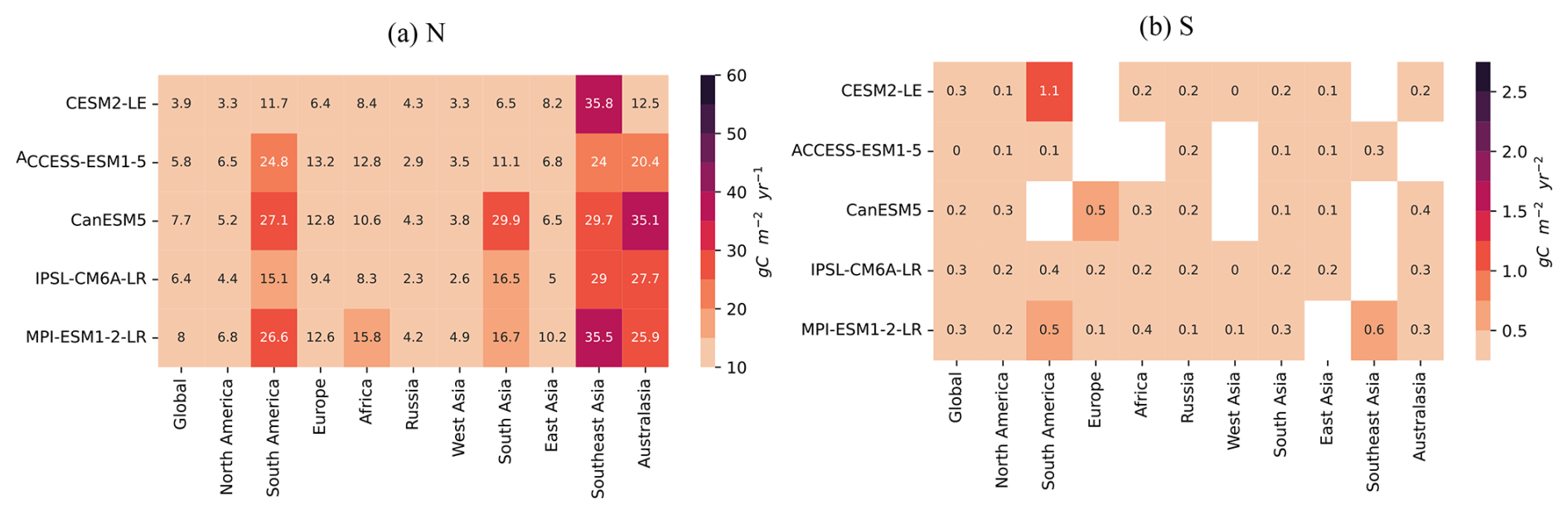 Figure A5Contribution of N and S to each RECCAP-2 region's ToE change in NBP, compared with global scale, in historical simulations. Note that we only show the values with change as the dominant contributor.