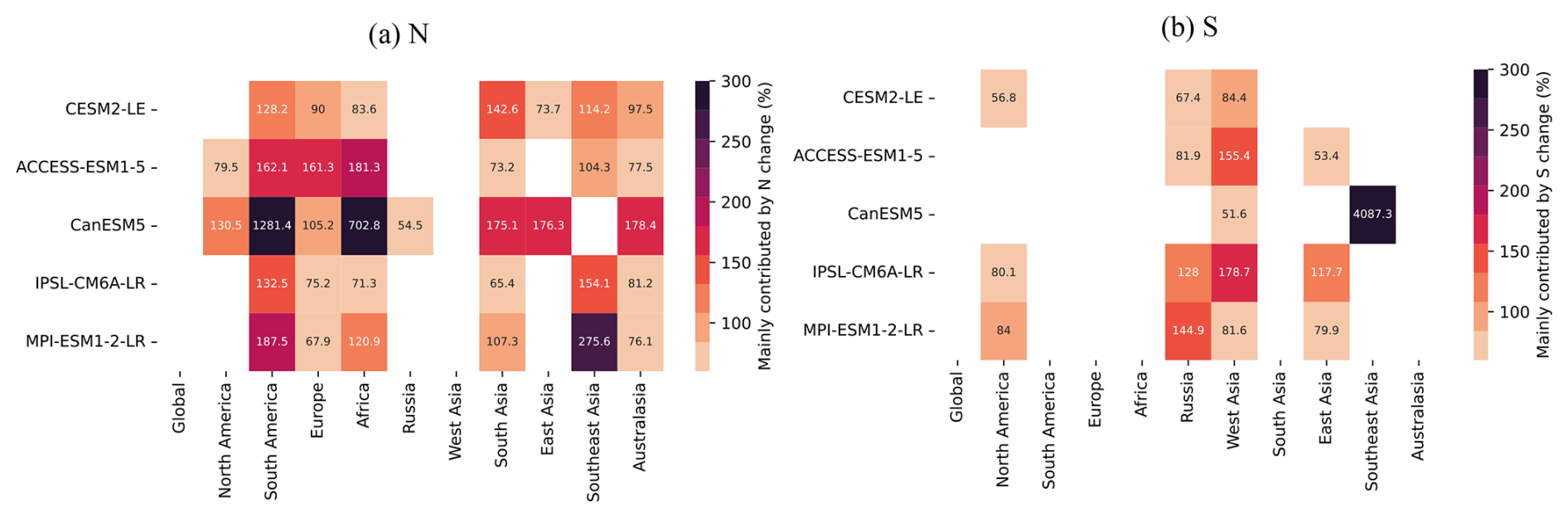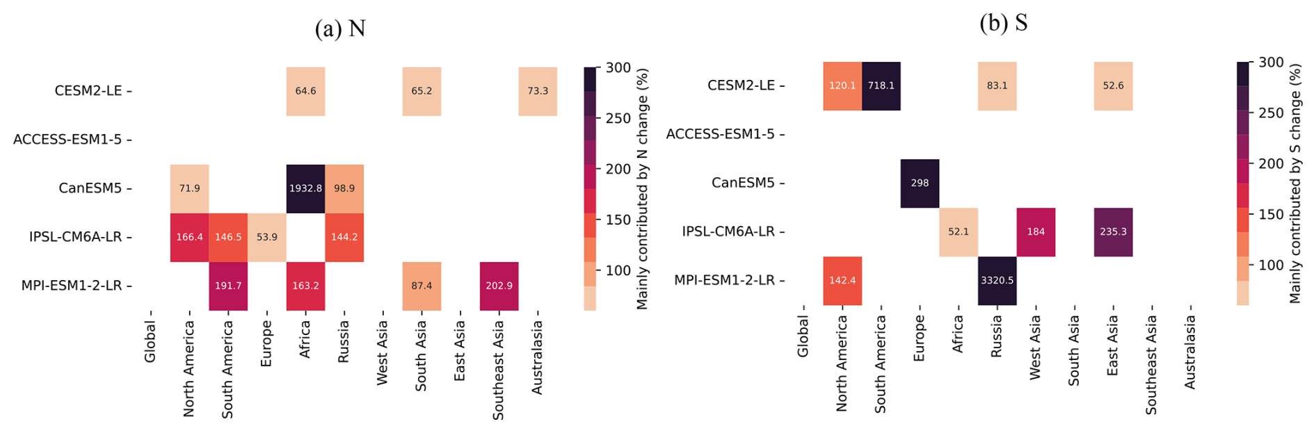 Figure A9Contribution of N and S to each RECCAP-2 region's ToE change in TER, compared with global scale, in historical simulations. Note that we only show the values with change as the dominant contributor.