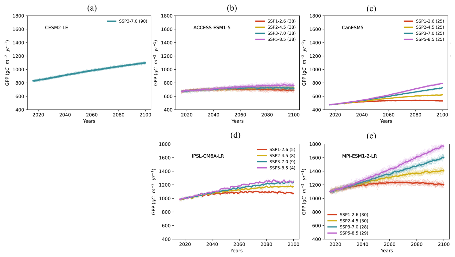 Figure A12The time series of future GPP from 2016 to 2100 across five ESM large ensembles. The four future scenarios include SSP1-2.6 (red line), SSP2-4.5 (yellow line), SSP3-7.0 (green line), and SSP5-8.5 (purple line). Thin lines represent individual simulations, while thick lines represent the ensemble mean for each scenario. The number of simulations for each model scenario is indicated in the legend next to the scenario label.