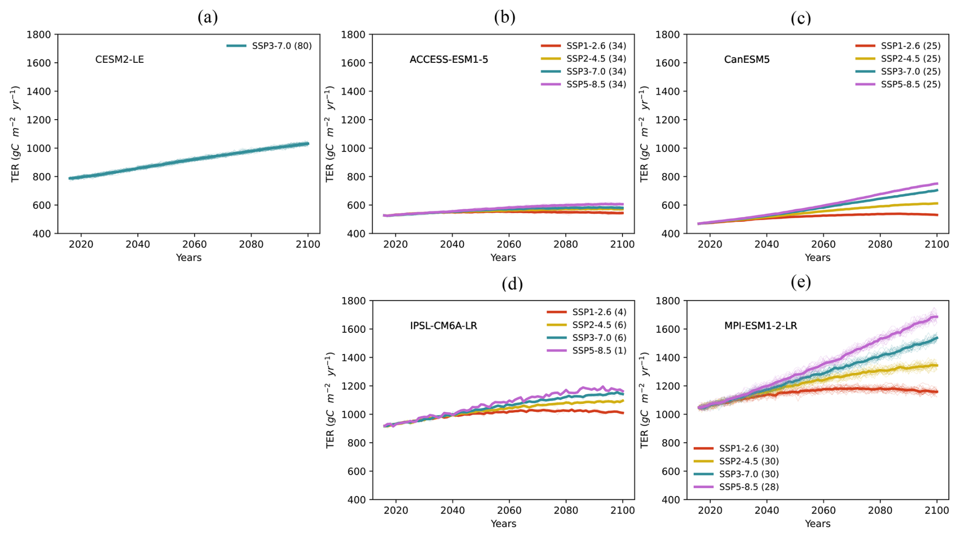 The historical simulations covers the period of 1851–2014 and the future scenario simulations cover the period from 2015 to 2100. The spatial resolution of CESM2-LE outputs is 0.9375° × 1.25°, and four CMIP6 models is 2.5° × 2.5° (pre-processed by Brunner et al. (2020) from their native spatial resolution). We select the net biome production (NBP), gross primary production (GPP), and total ecosystem respiration (TER) from the above five ESMs. Note that the TER in CESM2-LE is calculated according to Eq. (1), where TER is estimated as the difference between GPP, primary production (NPP), corresponding to autotrophic respiration, soil respiration (SR), and litter respiration (LR) (Eq. 1).