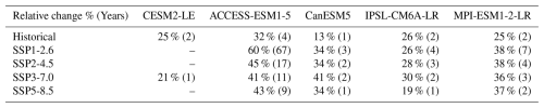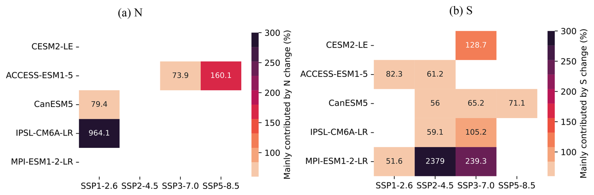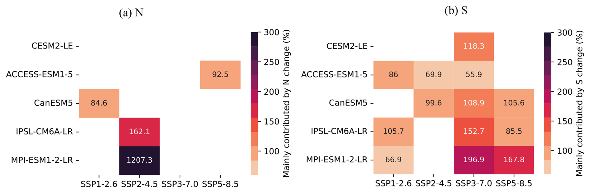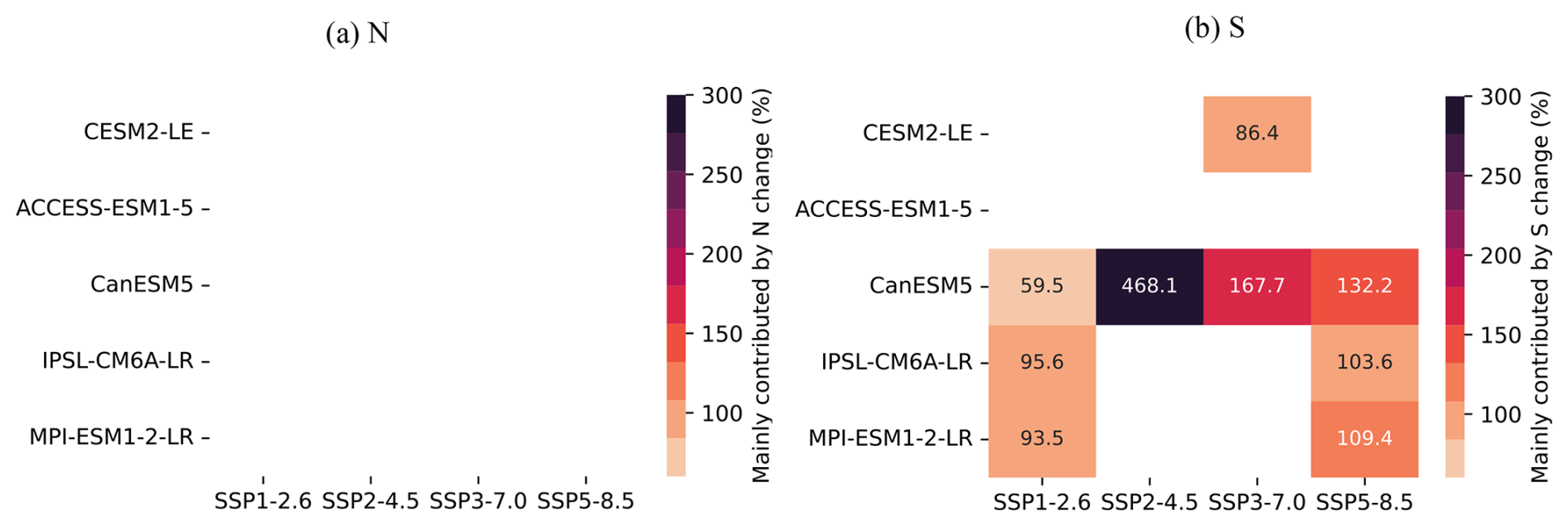 Figure A18Contribution of N and S to ToE changes in TER for each future scenario, compared with global scale in historical simulations. Note that only values where changes in N or S are the dominant contributor are shown.