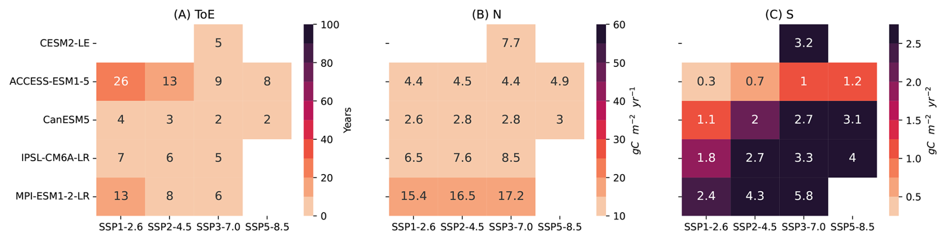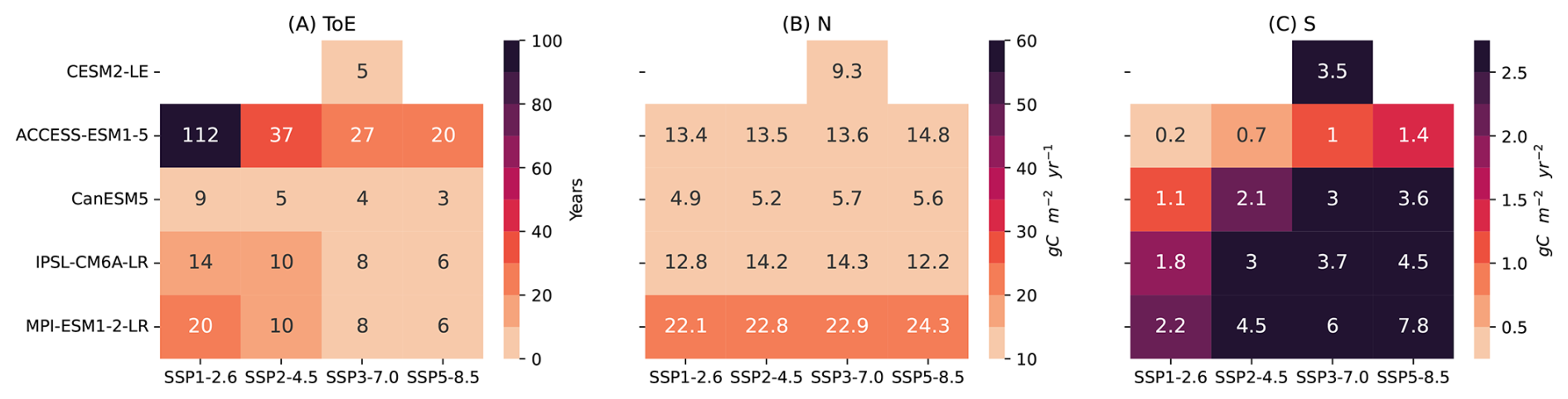 To determine the time of emergence (ToE), we apply the noise-to-signal ratio approach, following Bonan et al. (2021). The signal (S) refers to the anthropogenic perturbation driven response, which is the linear regression slope of the ensemble mean of the simulations for each model (Bonan et al., 2021). For the calculation of N, we first select all years across all model simulations over the selected period, then mix the data from all years in the selected period together and calculate the standard deviation. In the historical simulations, the noise (N) corresponds to the standard deviation of the ensemble before the 1960s (here is 1930–1959), a period less affected by human activities compared to more recent ones, and used as the baseline for natural variability (Bonan et al., 2021). In the future scenarios, we calculate the ToE for NBP, GPP, and TER, with the signal period in 2020–2070 and the noise period in 2020–2070 (with the ensemble mean removed). ToE (Eq. 3) represents the time needed for the anthropogenic perturbed signal to become larger than the amplitude of the noise (Bonan et al., 2021).
