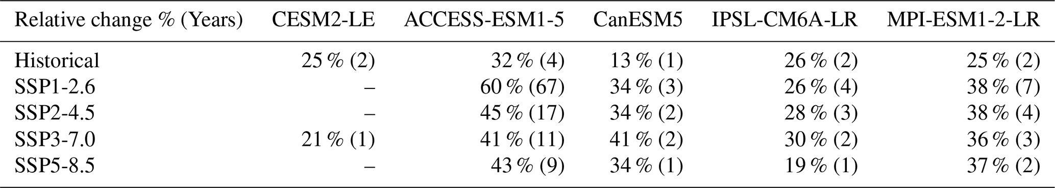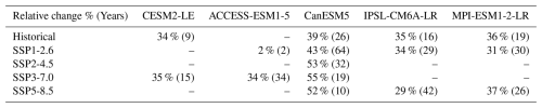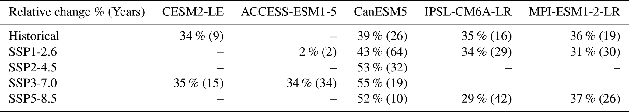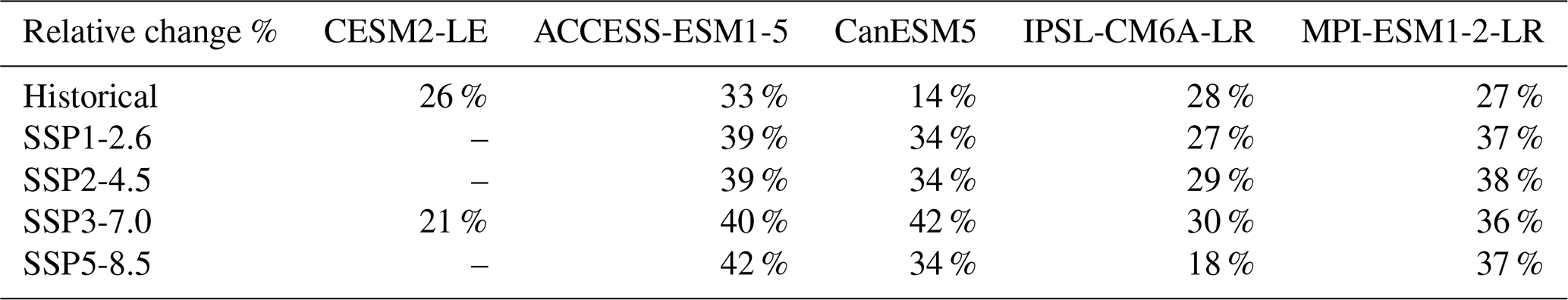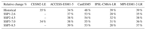 The noise of global NBP is substantially reduced after filtering out circulation-induced variability, so that ToE is reduced in both historical simulations and future scenarios (Fig. 6, Appendix A, Table A1). In the historical simulations, the relative reduction in ToE ranges from 34 % (CESM2-LE) to 39 % (CanESM5), corresponding to 9 and 26 years, respectively (Fig. 6, Table A1). For future scenarios, the reduction ranges from 29 % to 55 % (42 and 19 years reduction, respectively), except for ACCESS-ESM1-5, where reductions are mostly less pronounced (Table A1). For GPP, the relative reduction in ToE is smaller (Fig. A19 and Table A3). In the historical simulations, it ranges from 13 % (CanESM5) to 32 % (ACCESS-ESM1-5), corresponding to 1 and 4 years, respectively (Fig. A19 and Table A3). For future scenarios, the relative reduction ranges from 19 % to 60 % (1 and 67 years reduction, respectively) (Fig. A19 and Table A3). The large reduction of ToE indicates that NBP and GPP are both substantially affected by circulation-induced variability.