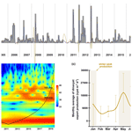 Besides the annual cycle, the wavelet power spectra showed 240 d, 480 d, and half-year cycles. The 240 and 480 d periods were only detected in the dinocyst time series. Therefore, no relationship between these period occurrences in the total dinocyst export flux and the studied environmental parameters could be drawn, and further study is required to investigate the possible driving factors. A significant power band close to 1920 d, which is equivalent to period of 1818 d shown by spectral analysis (Figs. A1 and A2), also occurred in time series of the total dinocyst export flux and all dinocysts group except for group D, pointing out to a period of around five years (Fig. 3b). However, the dinocyst record spans only 18 years, which means further investigation is required to see if the five-year period remains consistent in a more extended time span of this sediment trap series.
