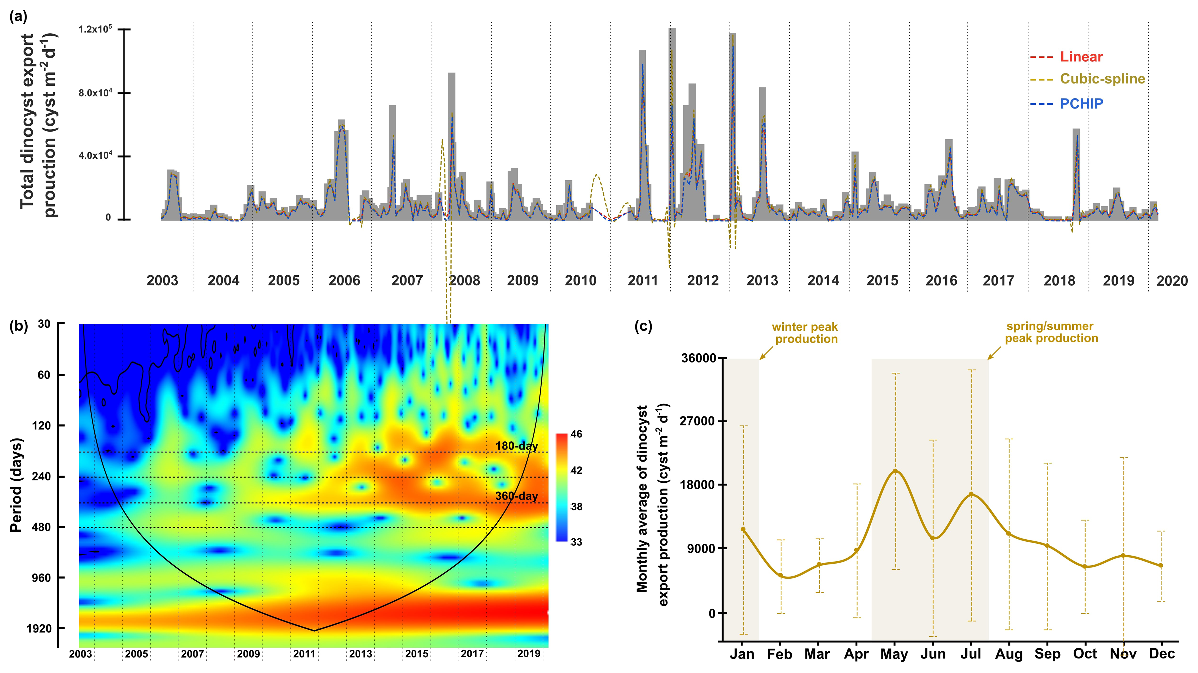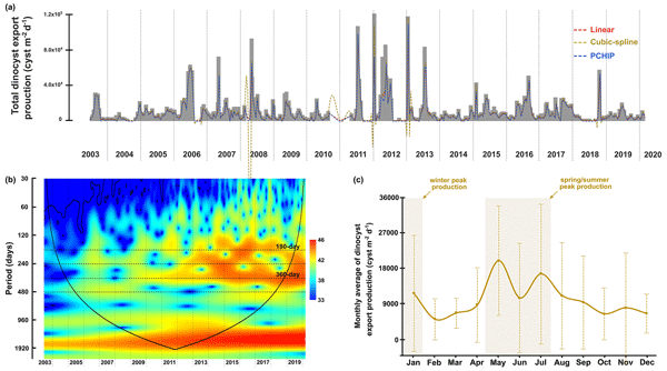 Figure 3The time series of total dinocyst export flux collected by the CBeu trap off Cape Blanc (NW African upwelling system). (a) The original time series of total dinocyst export flux in grey bars and interpolated data are represented by dashed lines with colours corresponding to each methodology. (b) The wavelet power spectra. The colour spectra indicate the different degrees of variance (ranging from high significance in red to low significance in blue), black lines indicate regions with a high level of significance (p=0.05), cone of influence surrounds the significant region of time and frequency that is not affected by the edges of the time series. (c) The monthly average flux of total dinocysts with standard deviation bars.
