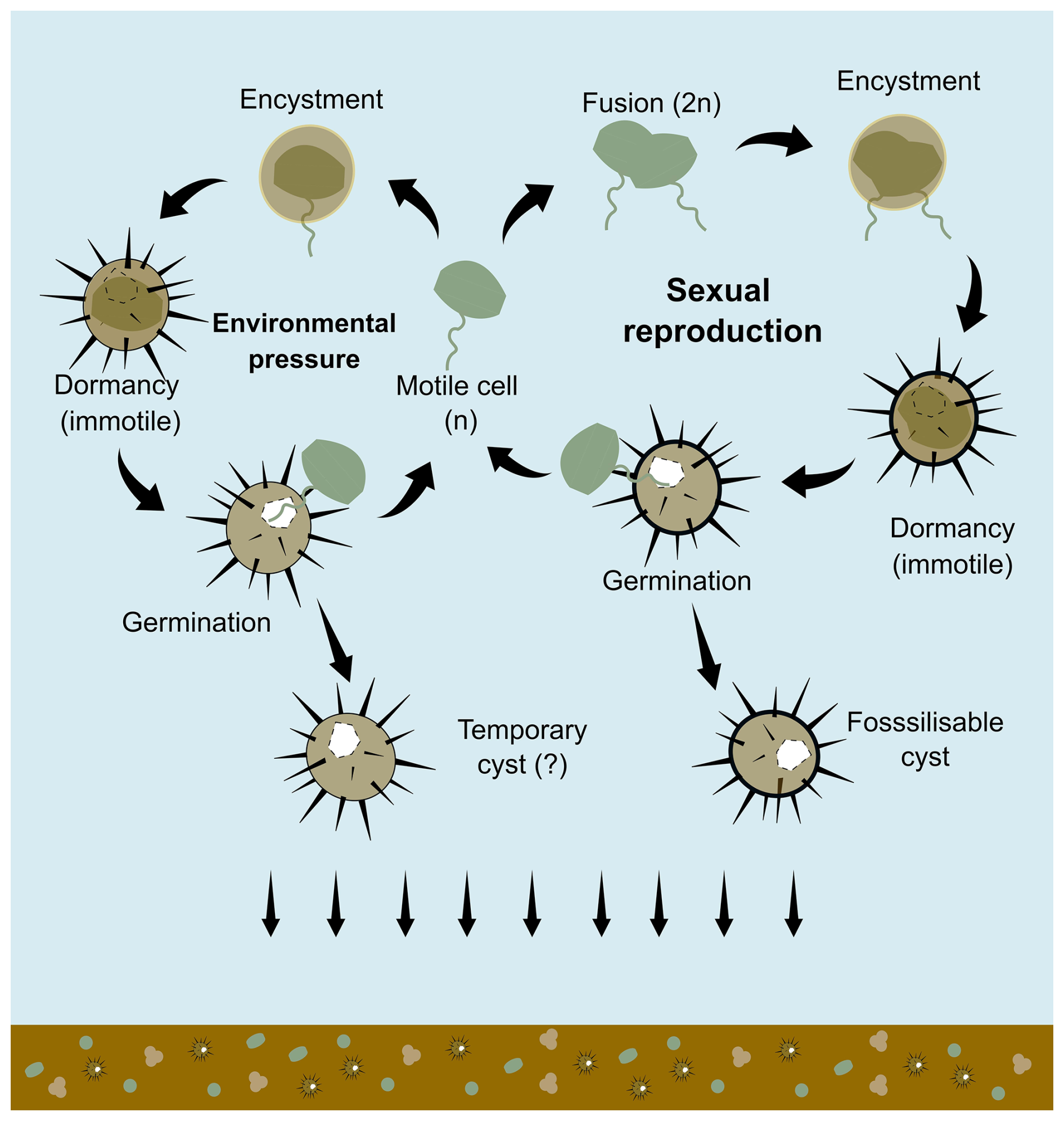 Figure 1The simplified scheme of dinoflagellate cysts formation (encystment) shows two types of cysts: fossilisable cysts through sexual reproduction and potentially temporary cysts that are not usually preserved in the fossil record. The scheme was drawn based on the result of in-situ observation by Zonneveld et al. (2022) and also adapted from Bravo and Figueroa (2014).