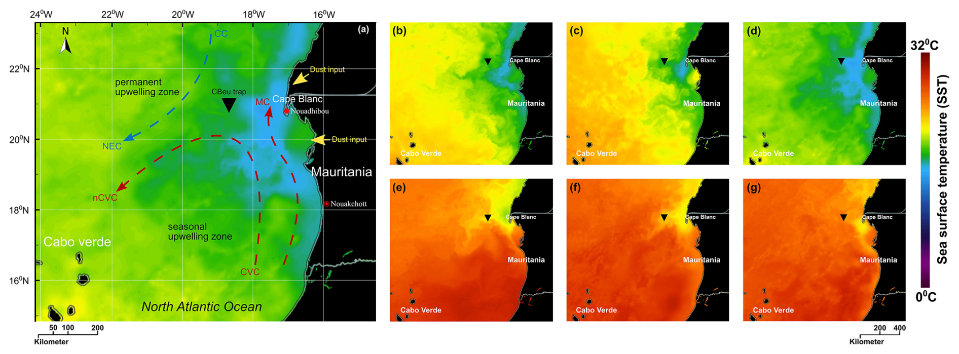 We conducted this study using the dinocyst export flux time series published by Roza et al. (2024). Dinocysts were collected with a sediment trap (CBeu) that was deployed in the upwelling region off Cape Blanc over an 18 year period. This sediment trap is located in an area influenced by upwelling, which is part of the Canary Current System, one of the EBEUs (e.g., Mittelstaedt, 1983; Hagen, 2001). In this region, nutrient fertilisation of the upper ocean production primarily comes from the upwelled deep waters, as well as from additional micronutrients originating from the Sahara (e.g., van Camp et al., 1991; Cropper et al., 2014; Chouza et al., 2016). Upwelling can be observed along the shelf break of the northwestern African shelf, with permanent year-round upwelling in the region off Cape Blanc, Mauritania (e.g., Cropper et al., 2014). Here, the local topography, atmospheric, and oceanic conditions facilitate the unique character of this upwelling zone, which also supplies nutrient-rich waters farther to the open ocean region via large filaments (Fig. 2a) (e.g., Mittelstaedt, 1991; van Camp et al., 1991; Hagen, 2001). Although the upwelling is a permanent feature, its intensity changes over the year as a result of the annual migration of the Intertropical Convergence Zone (ITCZ) (e.g., Hagen, 2001; Faye et al., 2015). Stronger upwelling is controlled by winds blowing from the northeast in winter and spring when ITCZ has migrated south (Fig. 2b–d), whereas upwelling is relaxed due to weakened wind speed coming from the east in summer to autumn when the ITCZ has its northernmost position (Fig. 2e–g) (Hagen, 2001; Faye et al., 2015). The ITCZ also controls the transport of Saharan dust into the study region by influencing the strength of the trade winds that carry the dust particles from the Sahara into the open ocean. High dust input to the East Atlantic occurs in winter and spring, while dust transported at higher altitudes reachesmore distal locations in summer and autumn (Ben-Ami et al., 2009; Skonieczny et al., 2013; Prospero et al., 2014).