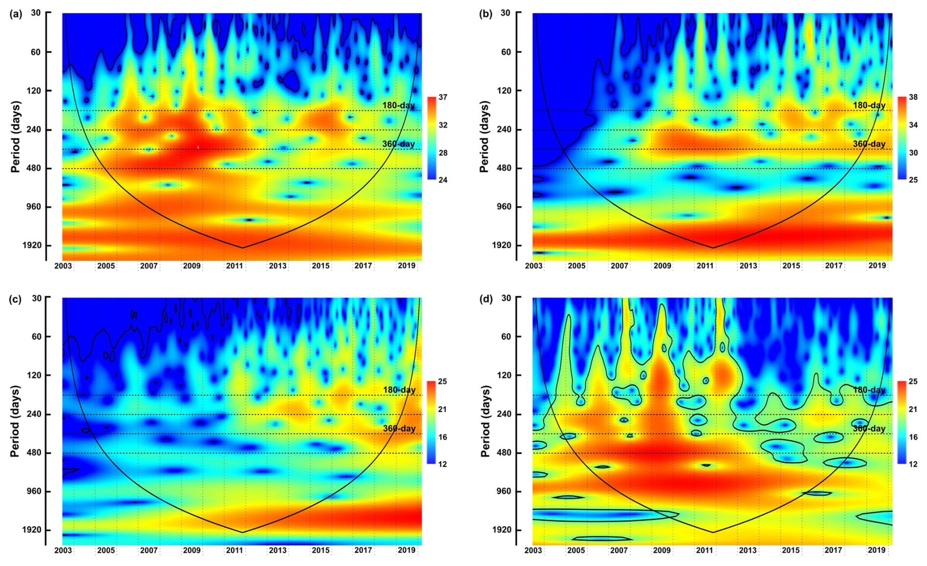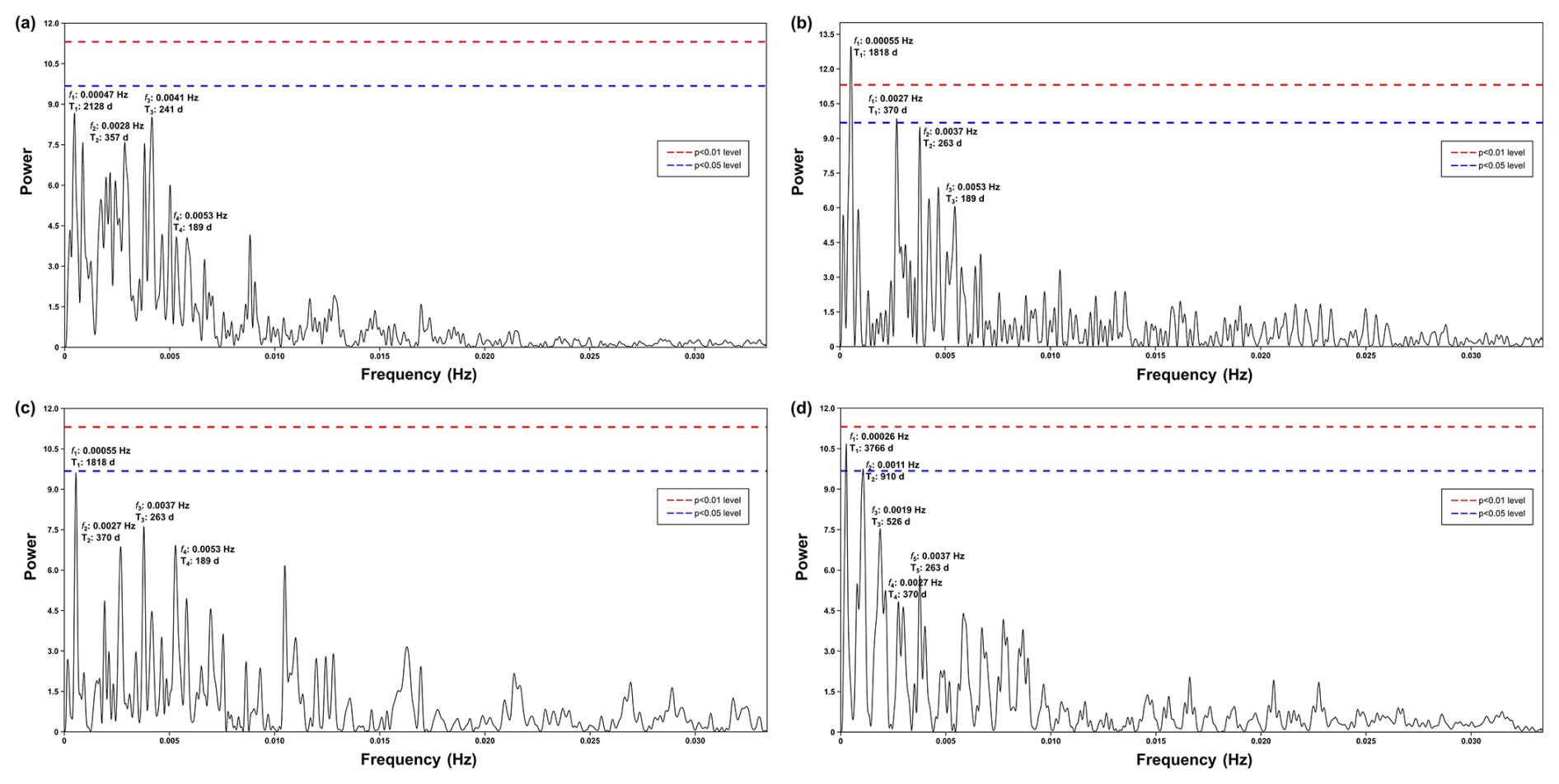 Figure A2Periodogram of spectral analysis in time series of (a) upwelling+dust group, (b) upwelling group, (c) cosmopolitan group, and (d) upwelling relaxation group. This graph shows that the annual and half-year cycles are clearly depicted in the upwelling and cosmopolitan groups, complementing their respective wavelet power spectra.