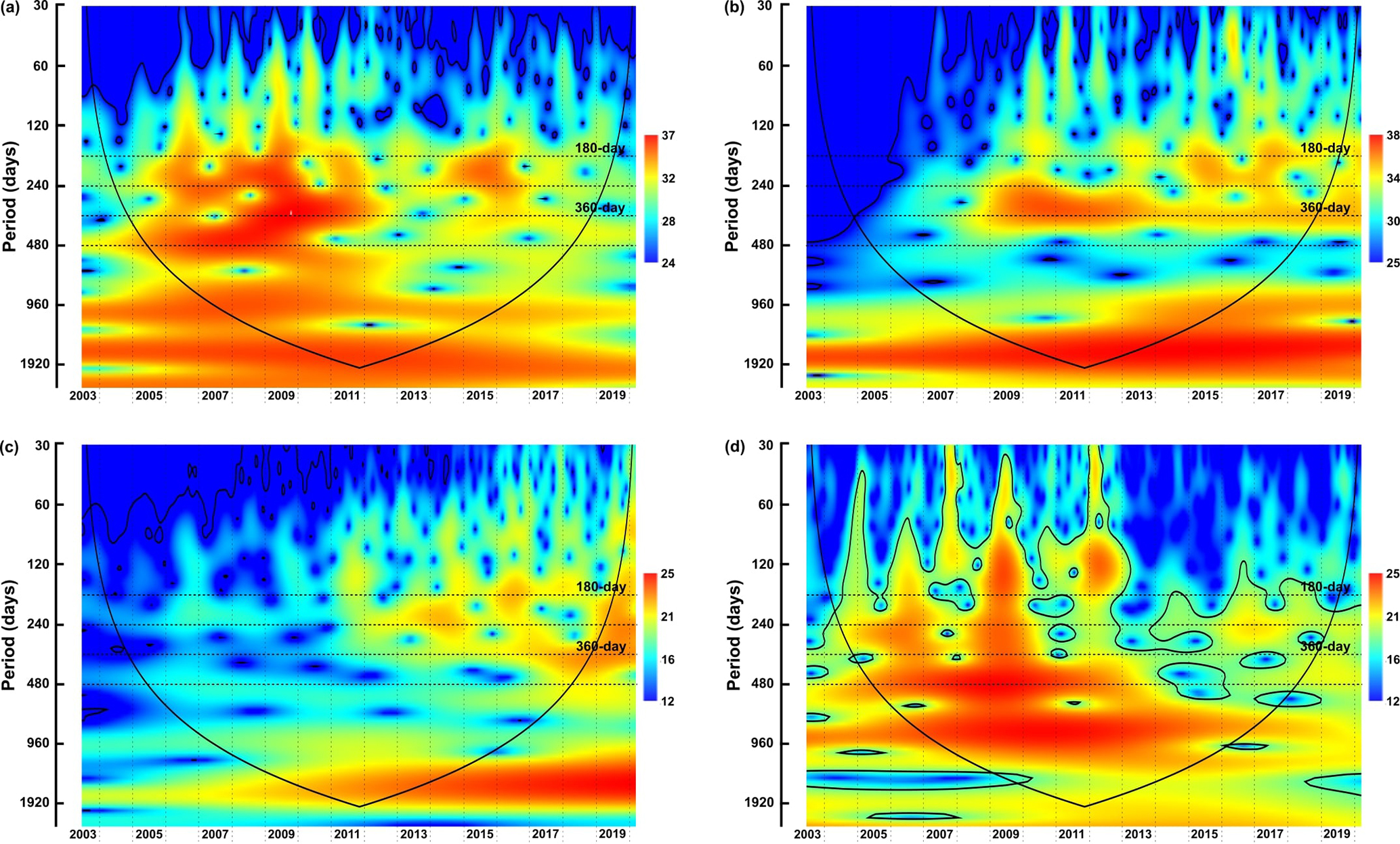 Phase III (2013–2020): The total dinocyst export flux showed stronger and intertwined half-year and annual cycles. Group A indicated a brief occurrence of both half-year and annual cycles, as well as the 240 d period (Fig. 4a). Group B showed somewhat intense half-year and annual cycles (but the annual cycle was of lower intensity than in the previous phase) (Fig. 4b). In group C, these three periods were more pronounced than in previous phases (Fig. 4c), while in group D, they were generally weak, but the 240 d period was the most noticeable (Fig. 4d).