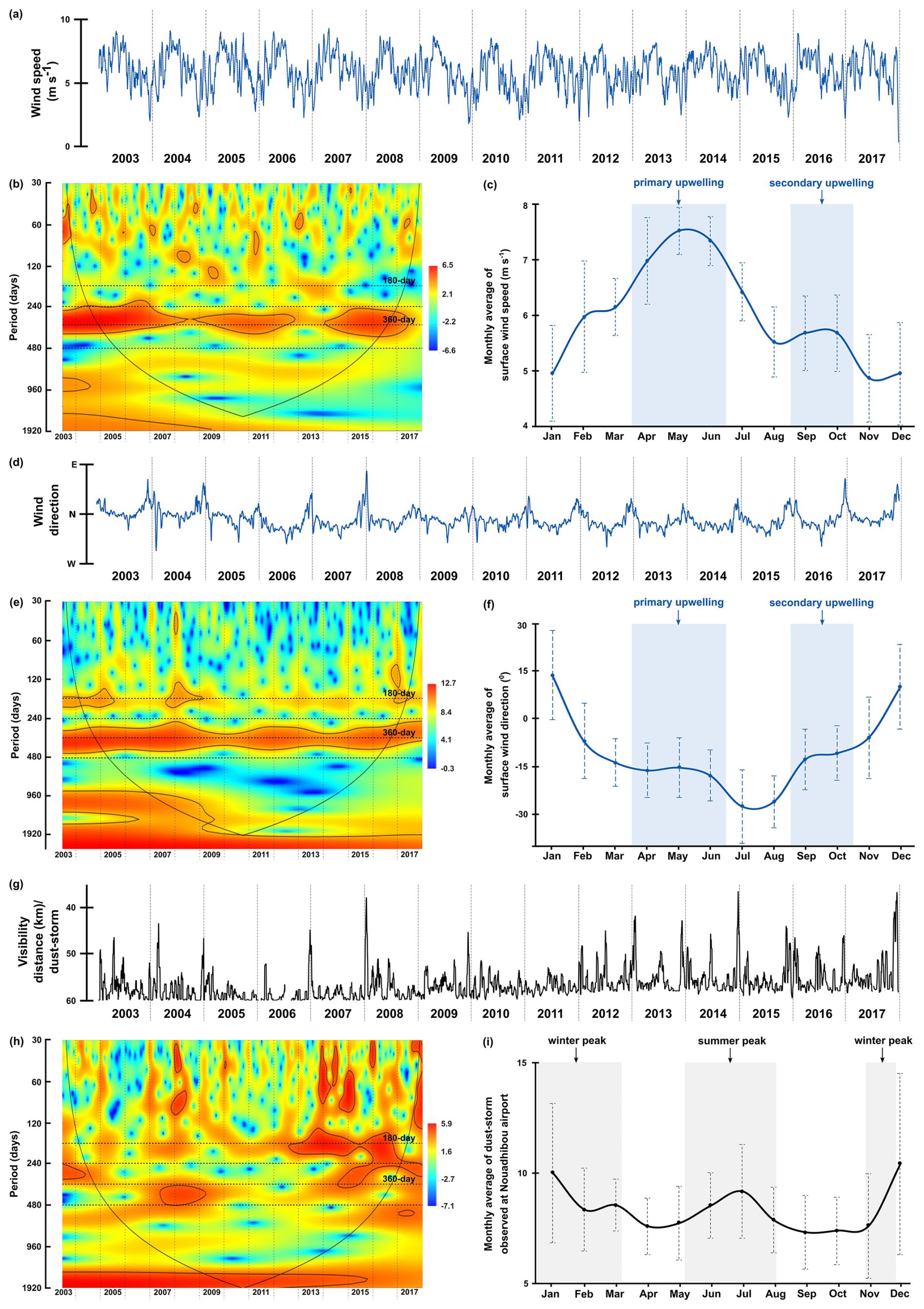 where ui is wind speed (m s−1) and θi is wind direction (°). Meanwhile, the aerosol dust data were transcribed from the horizontal visibility distance at the airport, which was decreased when the dust storm activity from the Sahara intensified. The time series of the surface wind and dust input in daily resolution were available from January 2003 to December 2017 (Fig. 5a, d, and g).