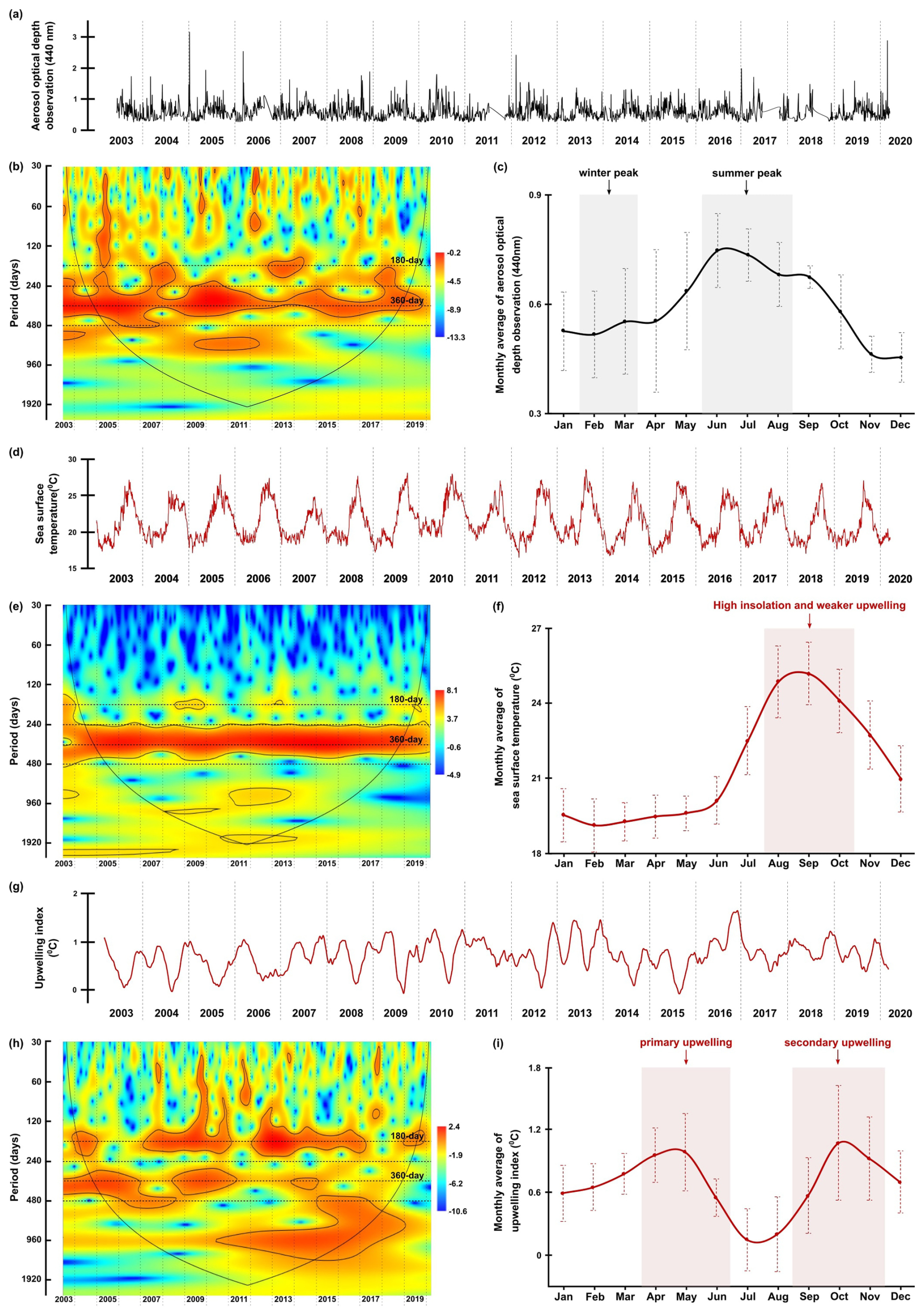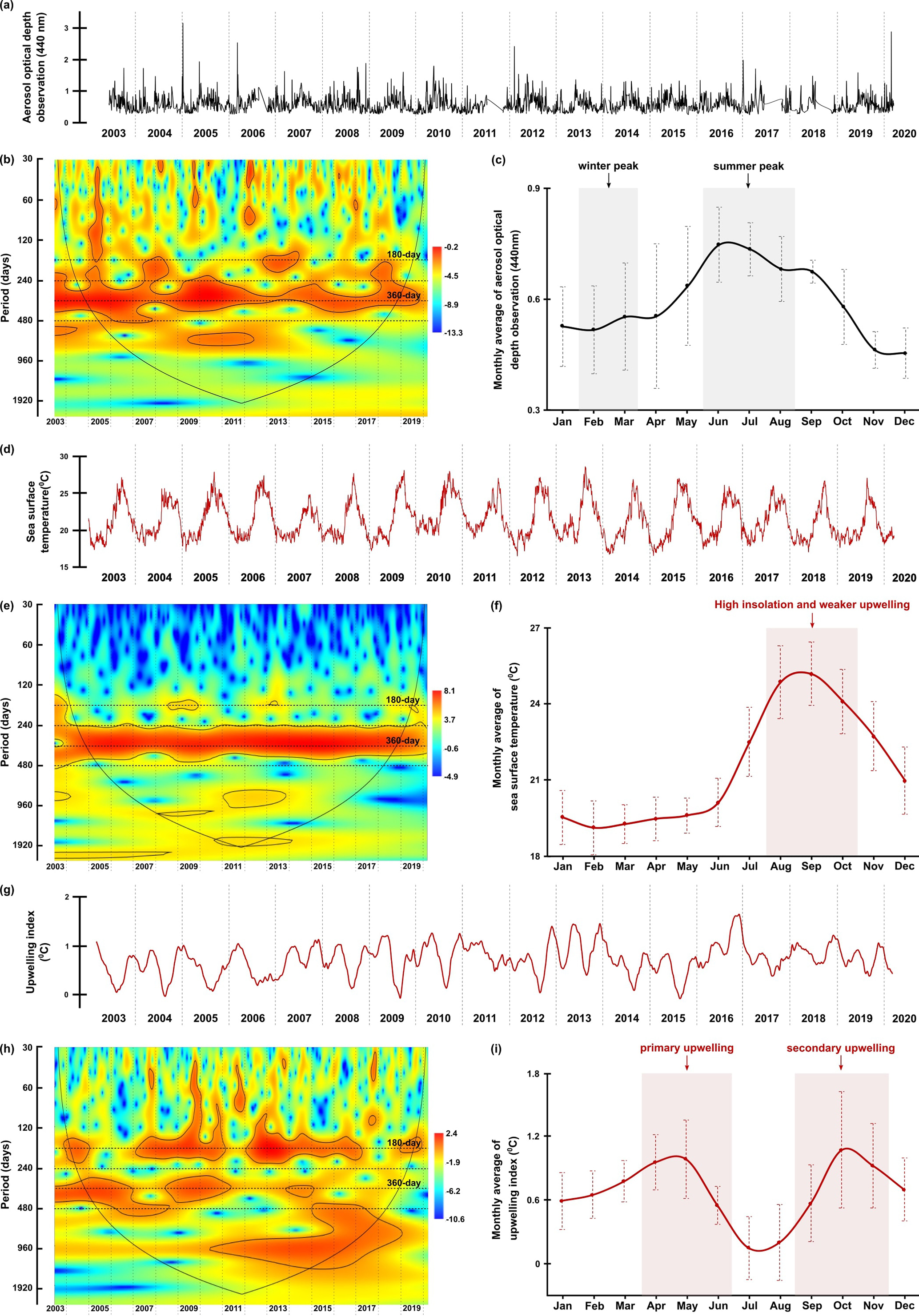 Figure 6The original time series, wavelet power spectra (left) and the monthly average values (right) of aerosol dust concentration (a–c) (aerosol optical depth) observed in Cabo Verde by NASA AERONET satellite, sea surface temperature (d–f), and upwelling index (g–i). Explanations of wavelet components follow the caption in Fig. 3.