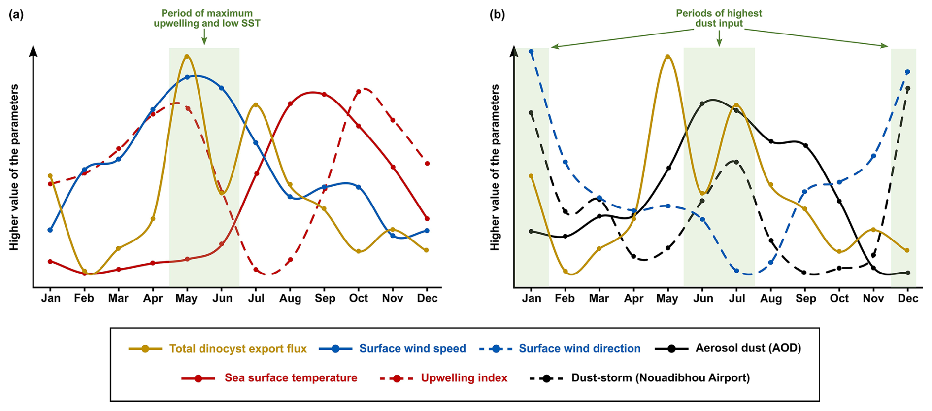 The three-step change demonstrated that upwelling significantly enhanced the dinocyst export flux from Phase 2 and further strengthened in Phase 3, when the flux was also influenced by Saharan dust input. Moreover, the southward movement of the Intertropical Convergence Zone (ITCZ) is suspected to have driven the shifts of those environmental parameters. This new result has notably contributed to the knowledge of the dinocyst ecology, which can be applied to improve their use as environmental indicators of modern and past upwelling ecosystems. In addition, the observed coupling between the annual and half-year cycles of the dinocyst export flux and trade wind dynamics evidenced the high reactivity of dinocysts to changes in the offshore ecosystems of the Northwest African upwelling system, highlighting the use of dinoflagellate cysts as a (paleo)climatic proxy.