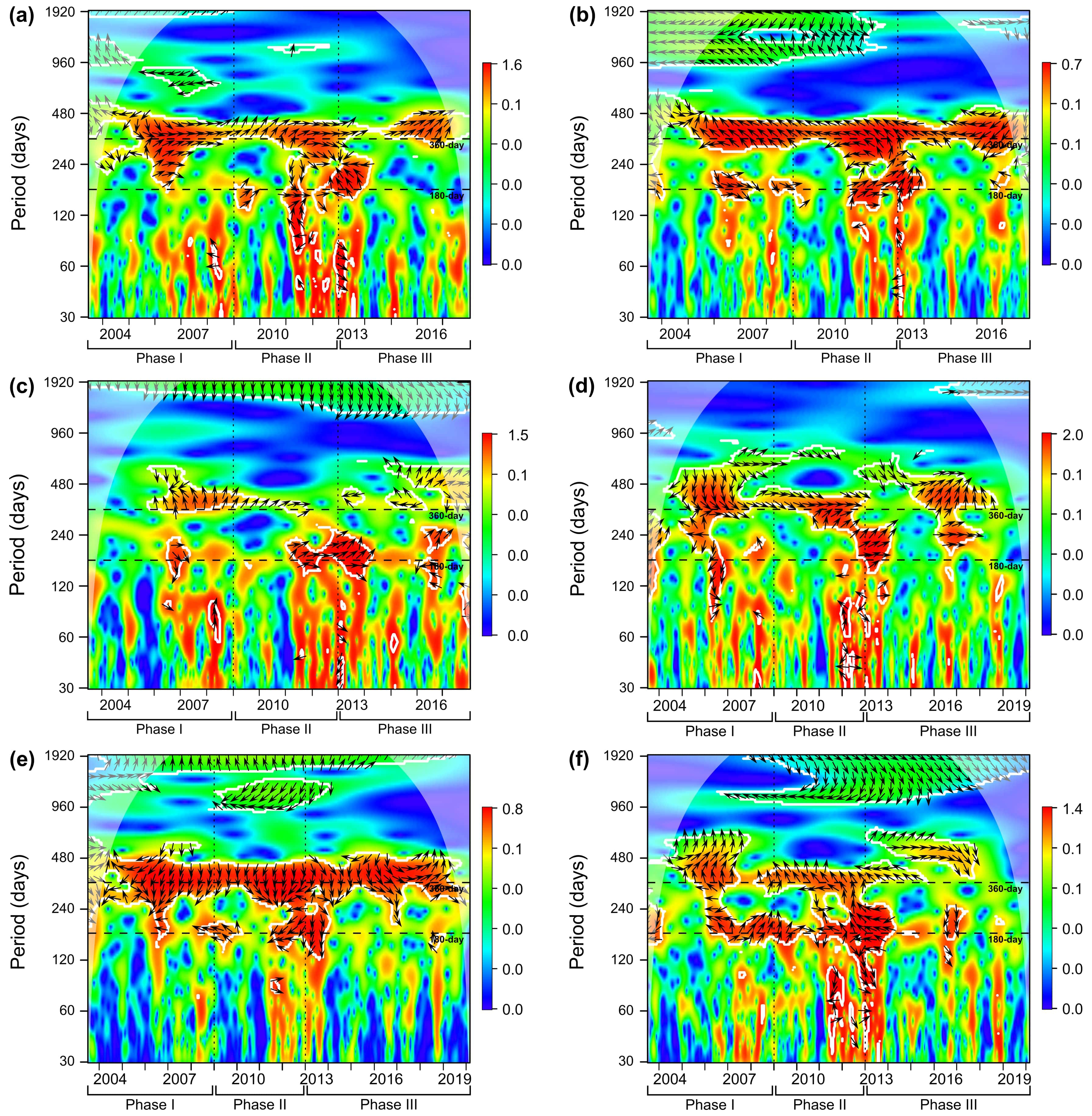 Phase I (2003–2008): Half-year and annual cycles were insignificant in the total dinocyst record but prominent in most environmental records. The upwelling+dust group mainly represented the periodicities of the total dinocyst export flux in this phase.