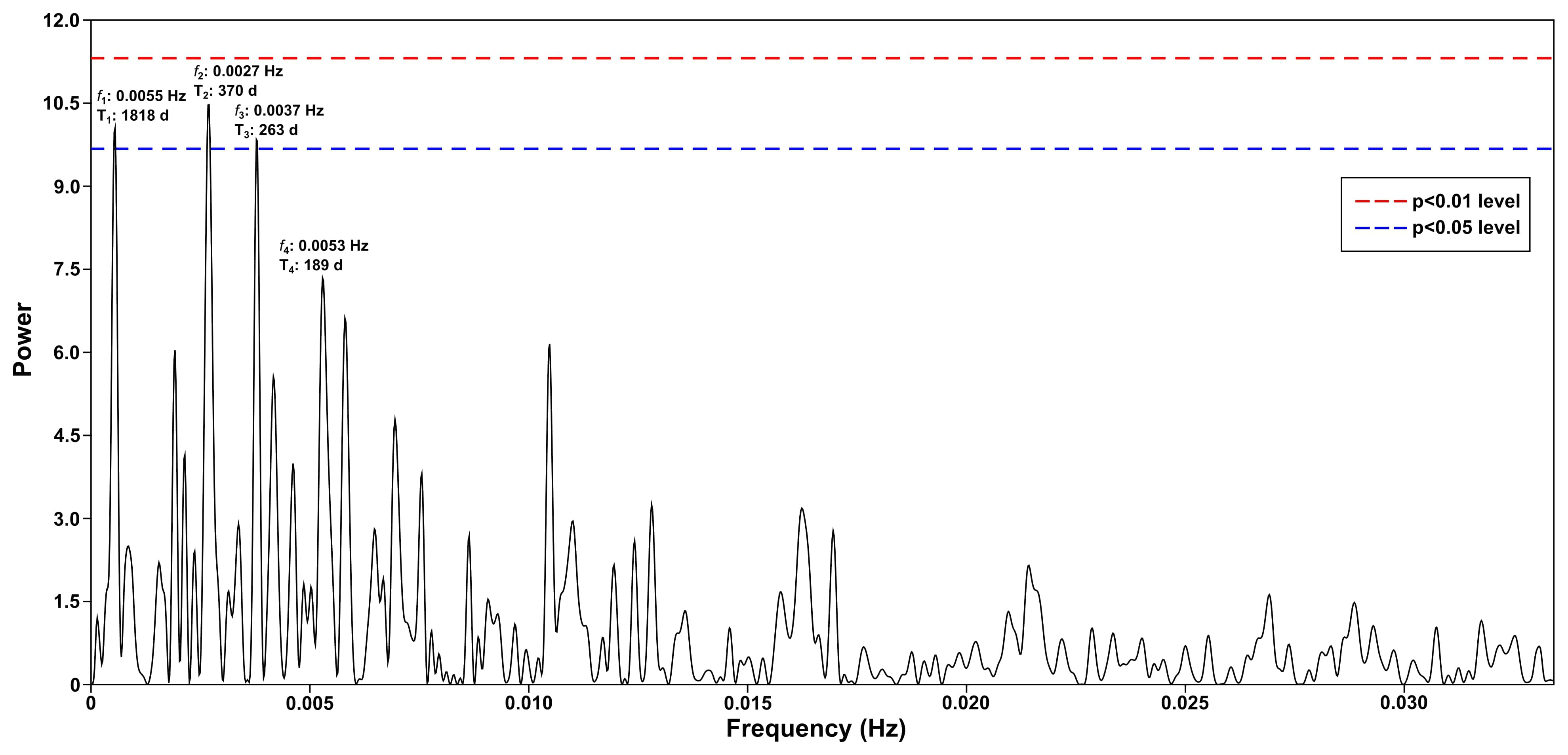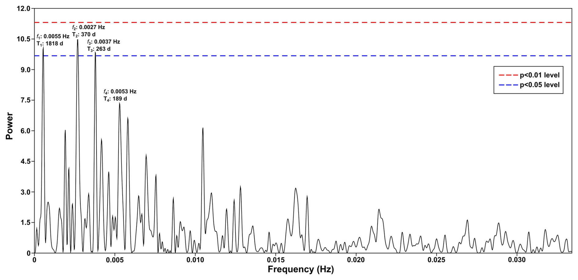Figure A1Periodogram of spectral analysis applied to the time series of total dinocysts export flux. This graph depicts the four highest frequencies (f) equivalent to periods (T) that occurred in the wavelet power spectra, of which three periodicities cross the significance line (p<0.05).