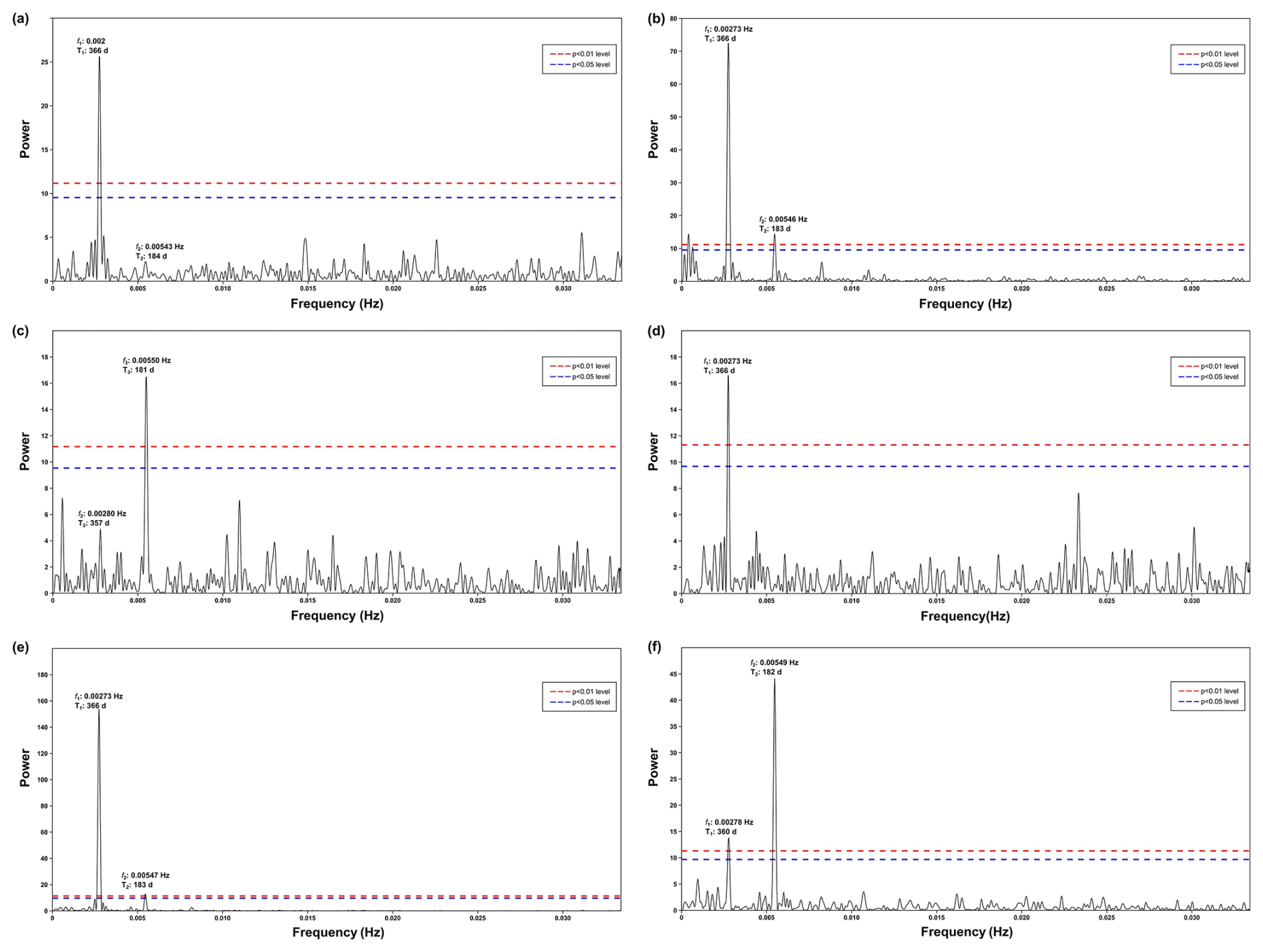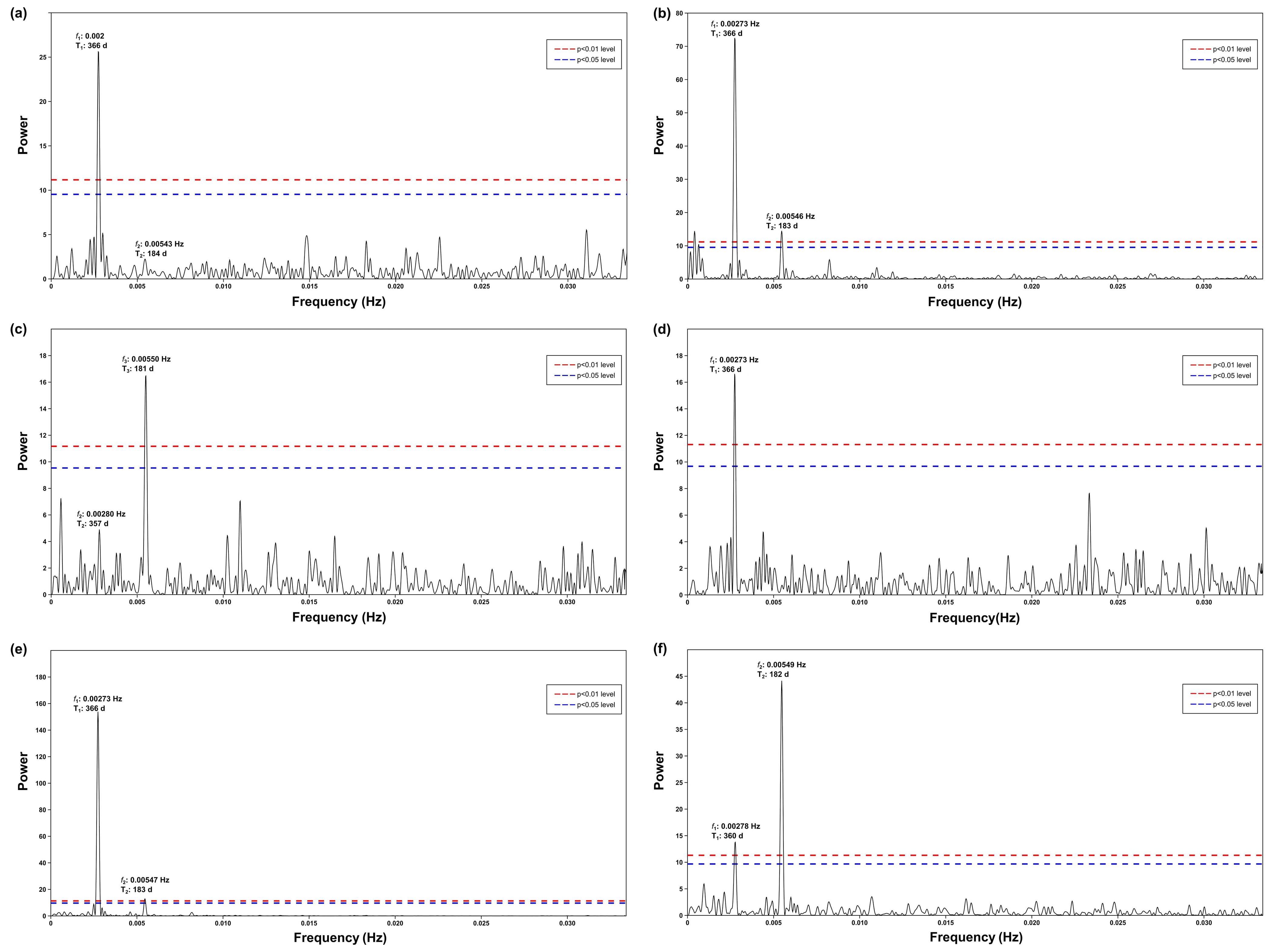 Figure A3Periodogram of spectral analysis in time series of (a) surface wind speed, (b) surface wind direction, (c) frequency of dust storm events observed at the Nouadhibou airport, (d) aerosol dust concentration (aerosol optical depth) observed in Cabo Verde by NASA AERONET satellite, (e) sea surface temperature, and (f) upwelling index.