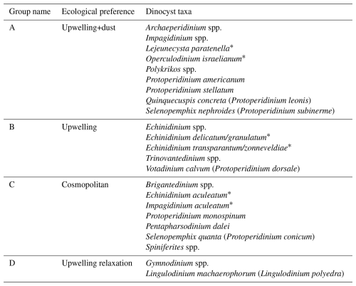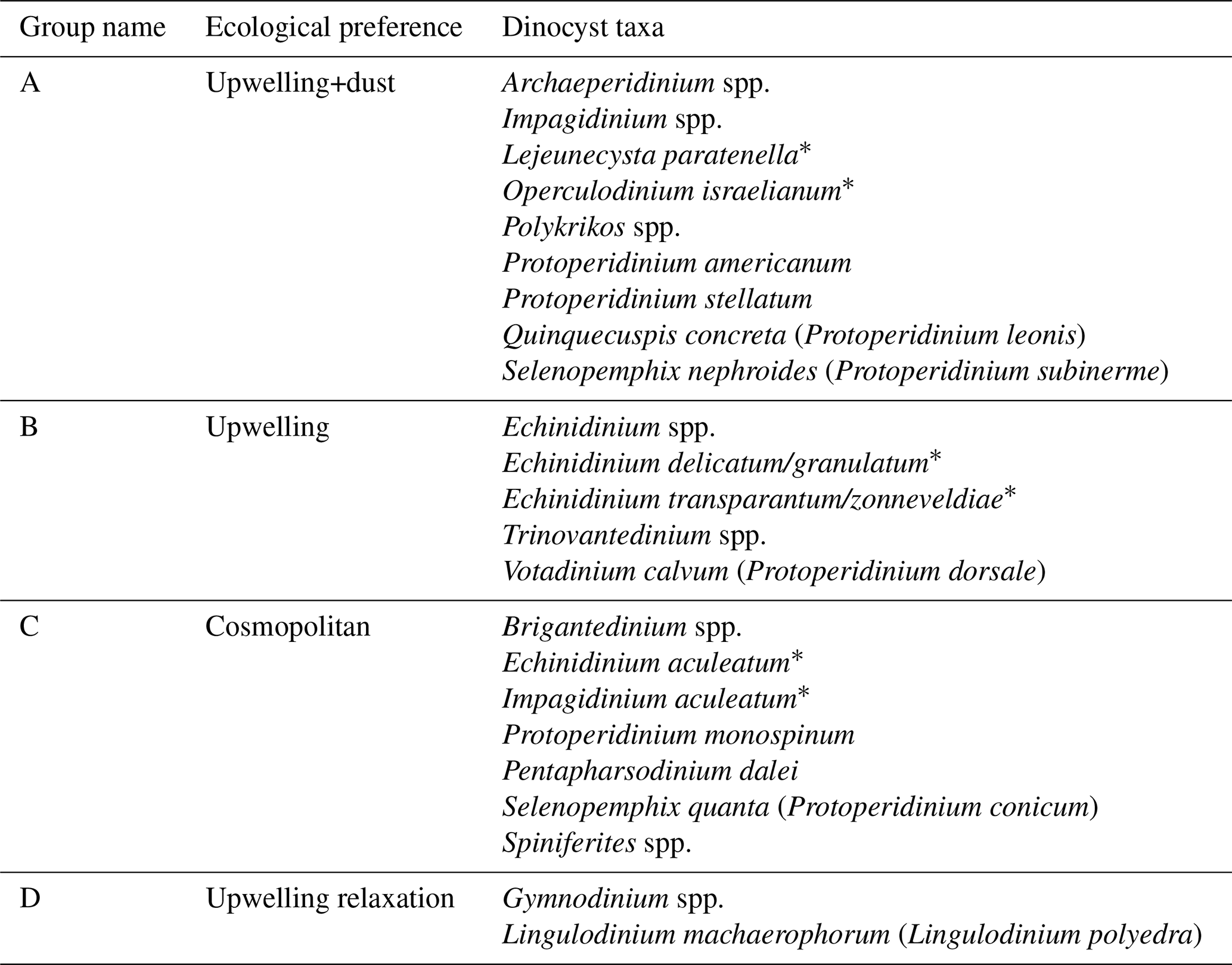Table 1The taxon list of dinocyst groups according to their relationship to the environmental preferences at the trap site, as established by Roza et al. (2024). The names in brackets are the motile names affiliated with the cyst, while dinocyst taxa with the asterisk symbol (*) are those whose motile names have not been described at the species level.