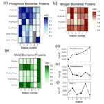 Based on these biogeochemical parameters, the phosphate-binding protein PstS, which is expressed under P-limiting conditions, would be expected to be prevalent throughout the transect consistent with low phosphate concentrations across the entire transect. Protein biomarkers would also be expected to indicate higher alkaline phosphatase (AP) abundances in the west, corresponding with the observed trends in APA. In addition, PhoX would be expected to be prevalent in the Fe-rich west, with greater prevalence of Fe-stress biomarkers in the east.