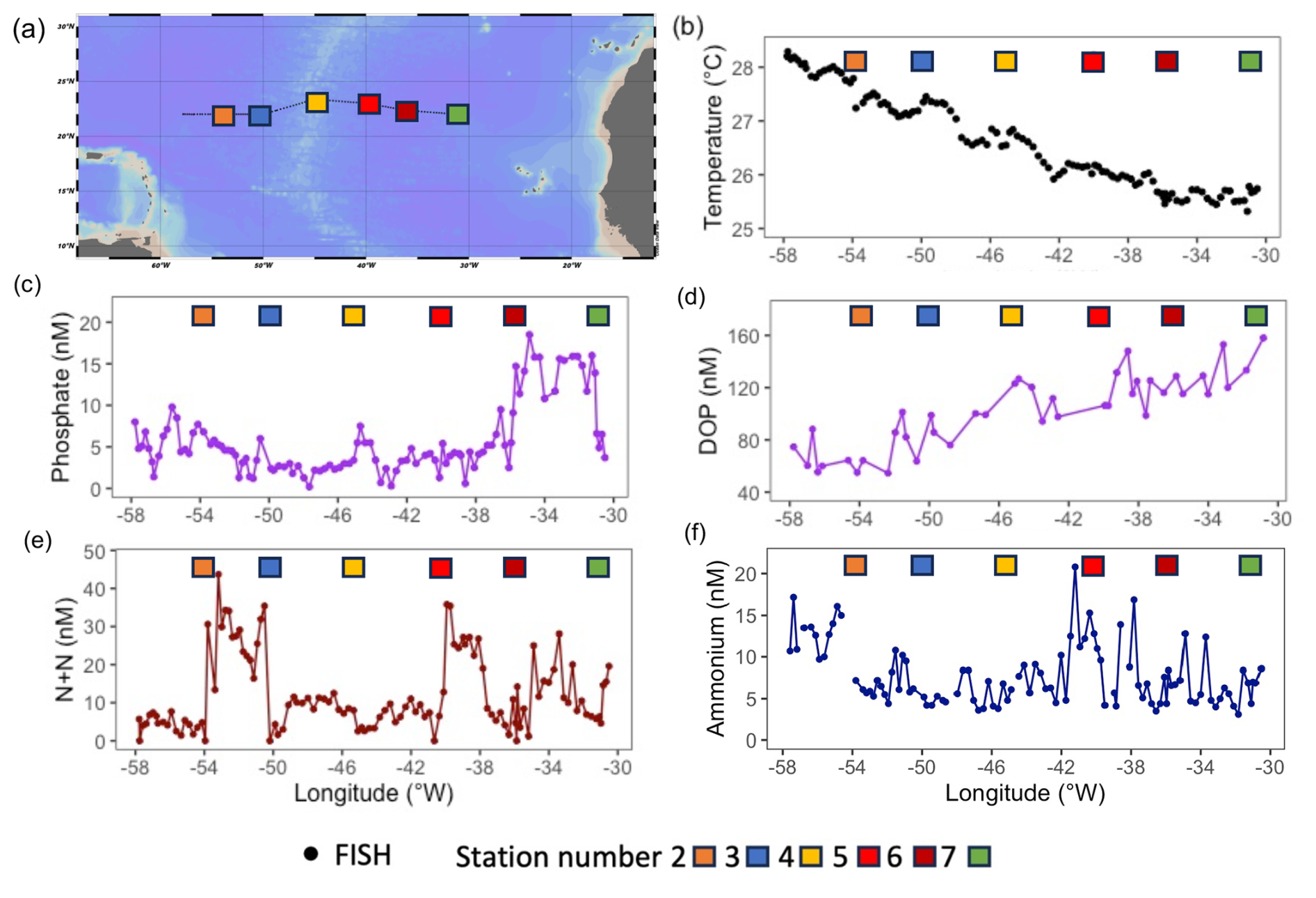 Strong zonal gradients were evident in surface temperature and phosphorus concentrations. From west to east, SST decreased by ∼ 3 °C (Fig. 1b), phosphate increased by ∼ 15 nM (Fig. 1c) and DOP increased 3-fold (from ∼ 50 nM to ∼ 150 nM, Fig. 1d). By comparison, there were no clear zonal trends in fixed nitrogen, with concentrations of nitrate plus nitrate (N + N, herein nitrate) ranging from < 10 nM to ∼ 40 nM (Fig. 1e) and ammonium, which ranged from 3 to 21 nM, being highest at stations 5 and 6 (Fig. 1f).