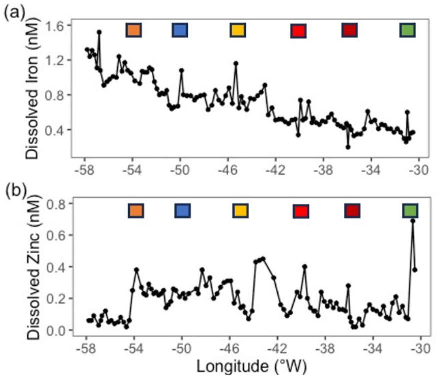 There was a clear zonal trend in dissolved Fe concentrations, which decreased west to east by ∼ 1.0 nM (Fig. 2a) owing to enhanced Saharan dust deposition in the western Atlantic Ocean (Kunde et al., 2019). In contrast, Zn concentrations were variable throughout the transect (ranging from 0.04 to 0.8 nM, Fig. 2b) and cobalt was constant (∼ 11 to 14 pM, data not shown).