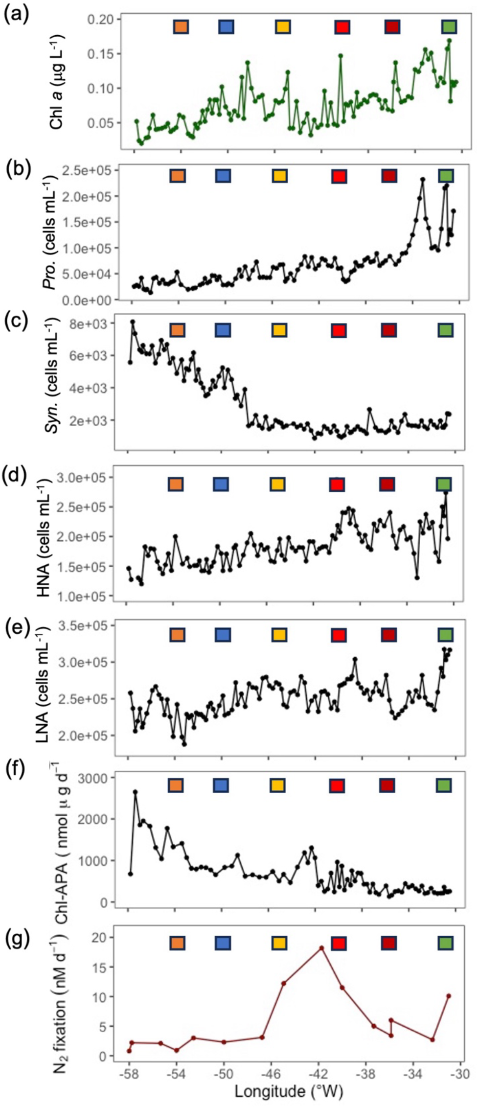 Figure 3Zonal gradients in (a) chlorophyll a concentrations (µg chl a L−1) and the abundance of (b) Prochlorococcus (cells mL−1), (c) Synechococcus (cells mL−1), (d) high nucleic acid bacteria (HNA, cells mL−1) and (e) low nucleic acid bacteria (LNA, cells mL−1), (f) chlorophyll a – corrected rates of alkaline phosphatase (nmol P mg chl d−1) and (g) mean rates of dinitrogen (N2) fixation (nM N d−1) with error bars as standard deviation of triplicate incubations. Samples captured from the towed FISH at ∼ 7 m. Coloured squares represent stations sampled during JC150 (see Fig. 1 for station names).