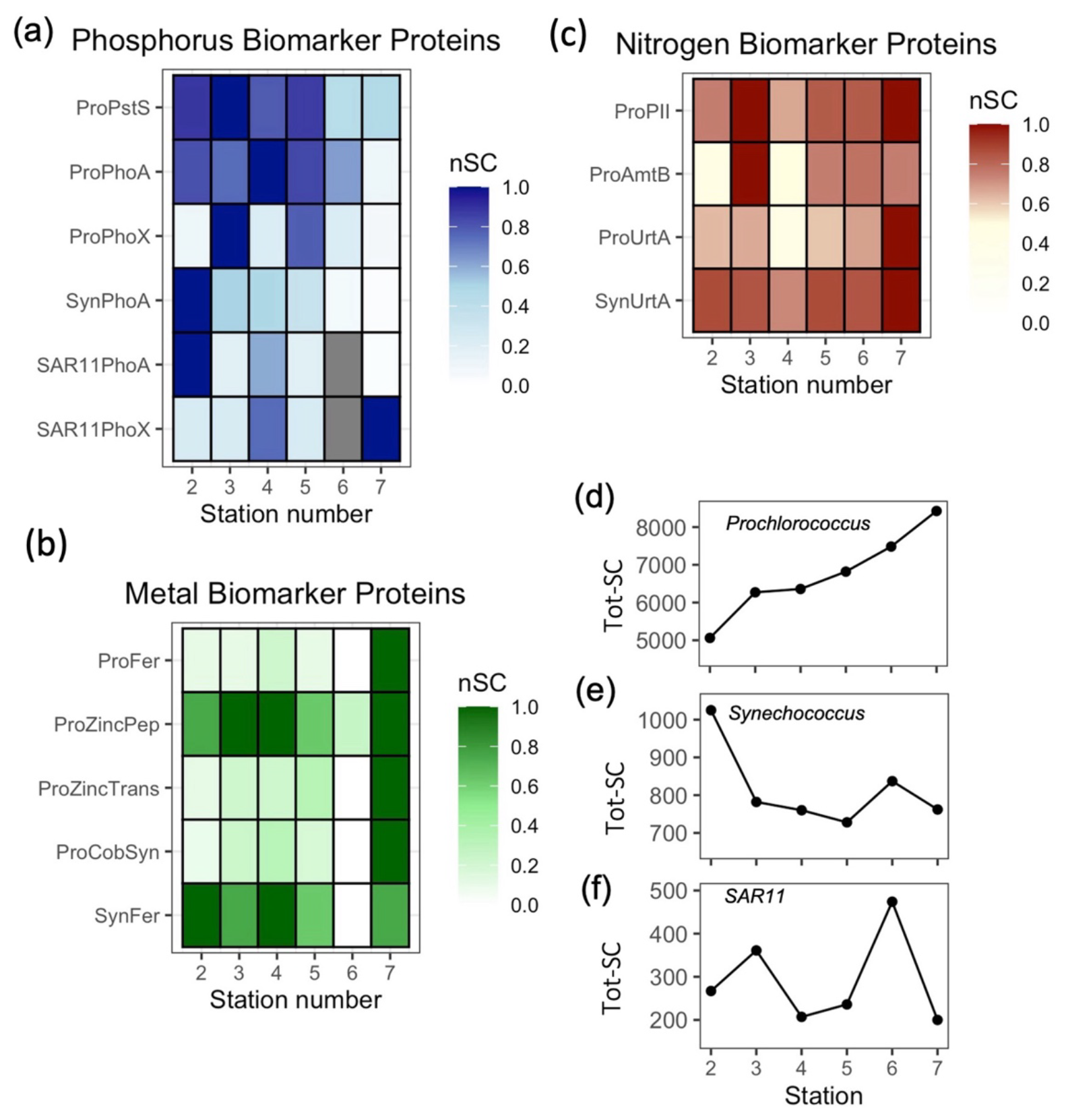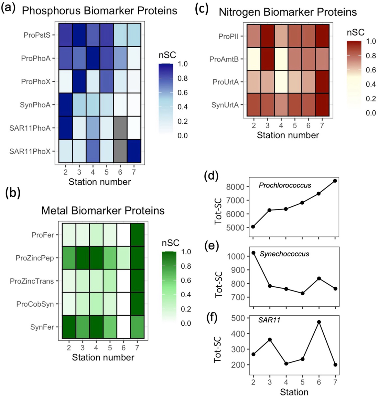 Figure 4Zonal gradients in the spectral counts (SC) of biomarker proteins in Prochlorococcus (Pro-), Synechococcus (Syn-) and SAR11 for (a) Phosphorus biomarker proteins; PstS, PhoA and PhoX, (b) Iron, zinc and cobalt biomarker proteins; Ferredoxin (Fd) and Zinc peptidase (ZincPep), Zinc transporters (ZincTrans) and Cobalamin Synthetase (CobW) (c) Nitrogen biomarker proteins: PII, AmtB and UrtA and (d) total protein for Prochlorococcus, (e) Synechococcus and (f) SAR11, presenting an independent measure of biomass. See Table 1 for details of the protein functions. nSC represents normalized spectral counts, which represents the spectral counts normalized to the maximum value of each protein across 6 stations. Tot-SC represents the sum of all normalized spectral counts for Prochlorococcus, Synechococcus or SAR11.