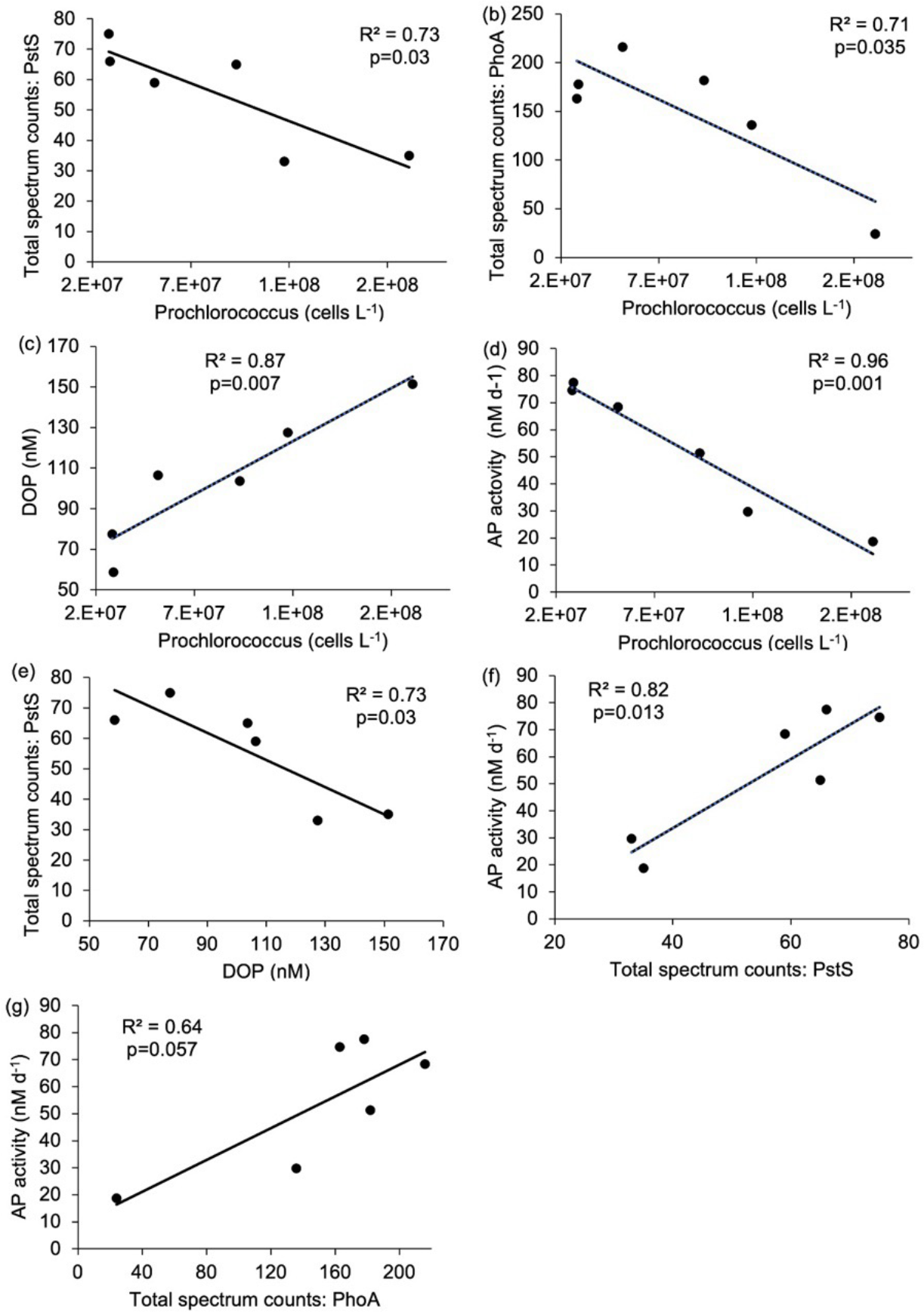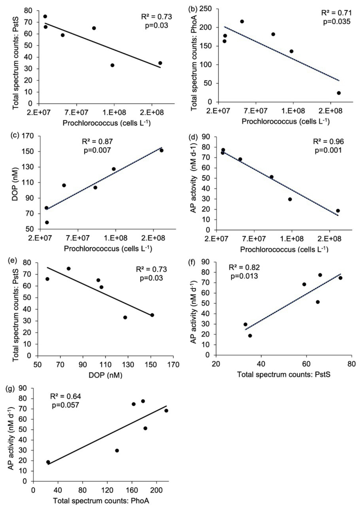 Figure 5Relationship between (a) Prochlorococcus cell abundance (cells L−1) and Pro-PstS (total spectrum counts), (b) Prochlorococcus cell abundance (cells L−1) and Pro-PhoA (total spectrum counts), (c) Prochlorococcus cell abundance (cells L−1) and dissolved organic phosphorus (DOP, nM), (d) Prochlorococcus cell abundance (cells L−1) and rates of alkaline phosphatase (APA, nM d−1), (e) DOP and Pro-PstS, (f) Pro-PstS and APA and (g) Pro-PhoA and APA. Results are linear regression as reported as R2 value and p-value. Relationships shown in (a) to (f) are considered statistically significant as p<0.05.