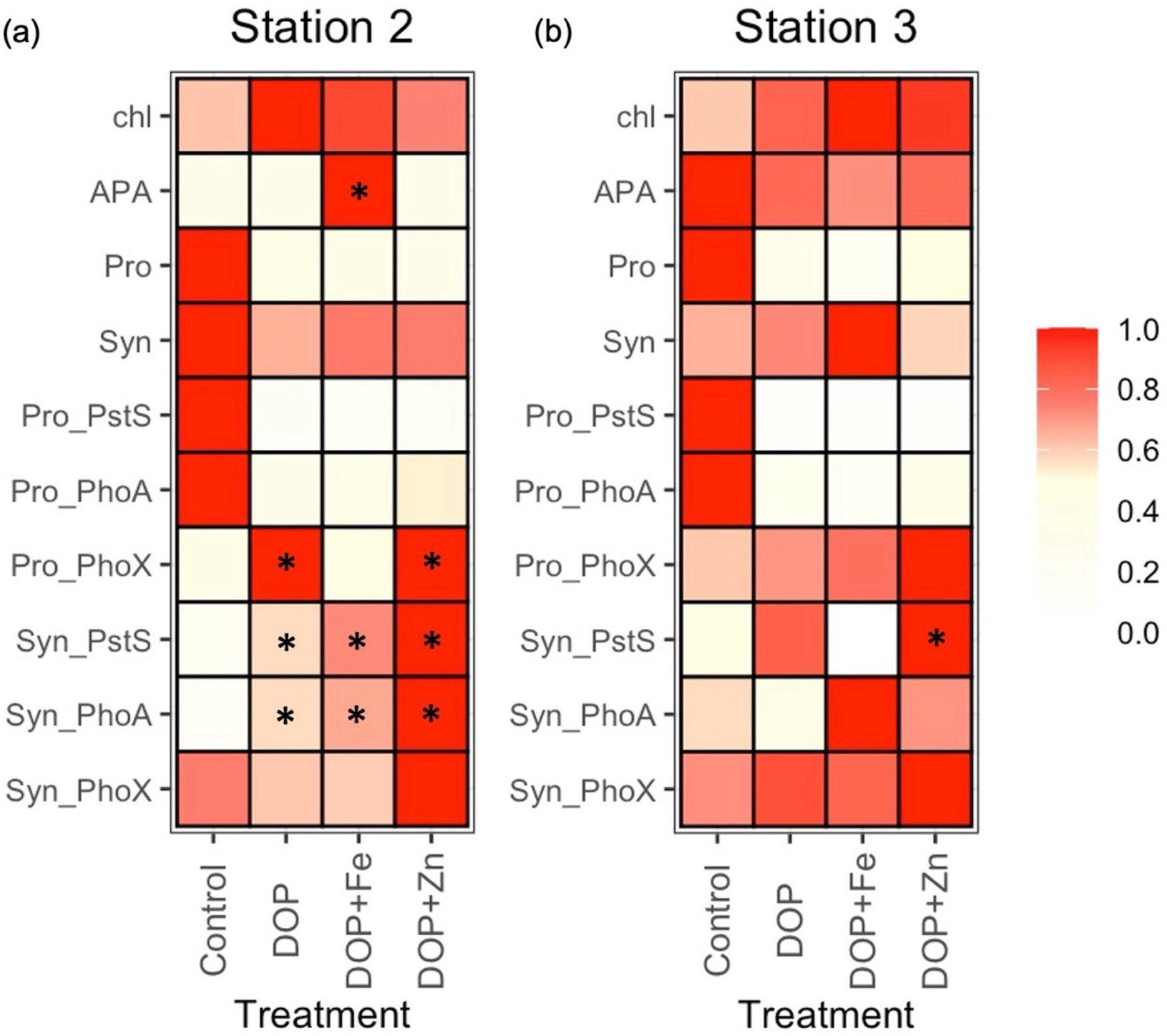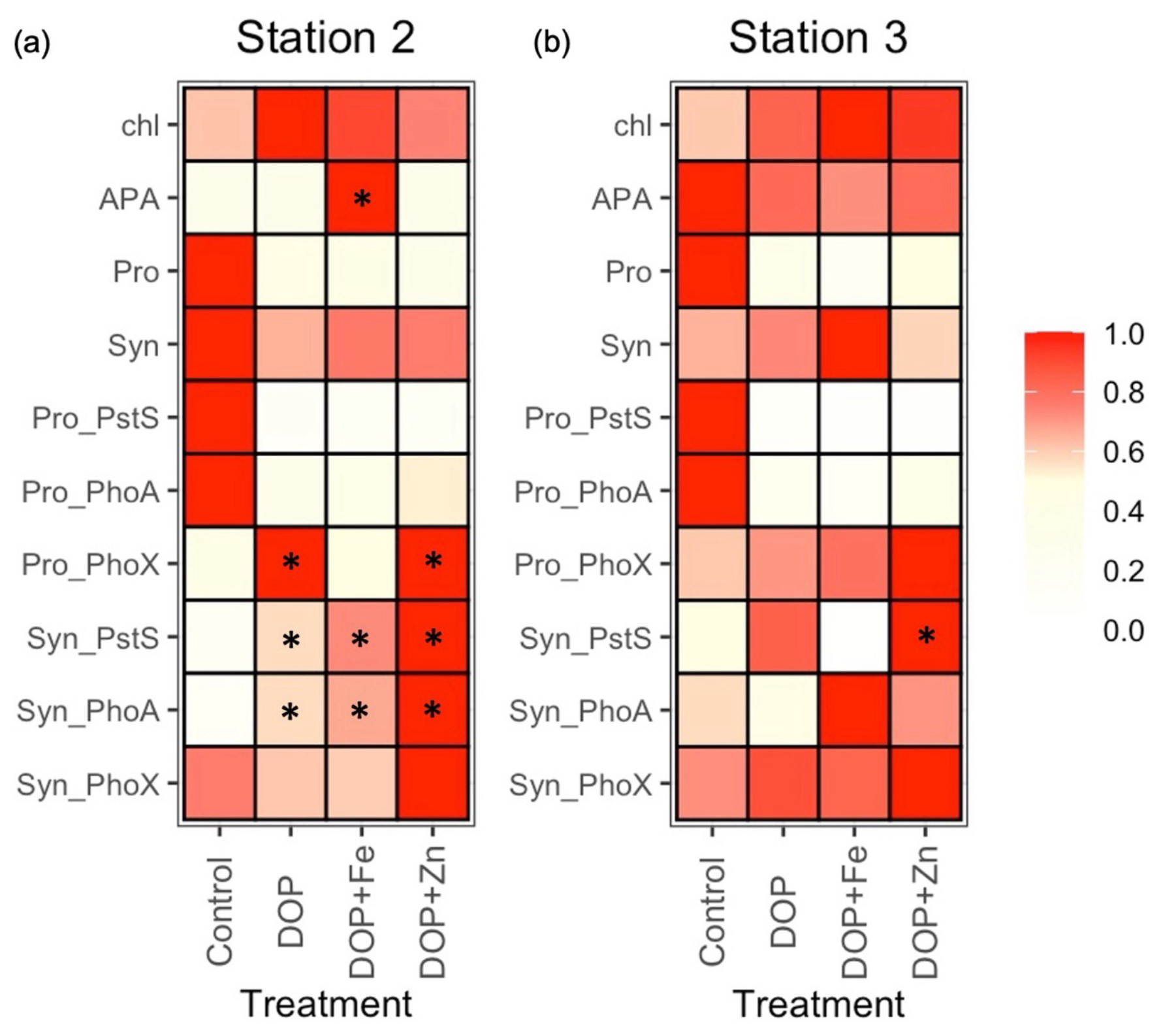 Figure 6Fractional (scale 0 to 1) change in states, rates and individual proteins in Prochlorococcus (Pro_) and Synechococcus (Syn-) after the addition of dissolved organic phosphorus (DOP), DOP and iron (DOP + Fe) and DOP and zinc (DOP + Zn) at station 2 (a) and station 3 (b) for chlorophyll a(chl), rates of alkaline phosphatase activity (APA), Prochlorococcus (Pro), Synechococcus (Syn) and protein biomarkers PstS, PhoA and PhoX. Coloured squares represent the mean of duplicate or triplicate samples and are normalised as the fraction of the maximum of that property in each experiment. See Table S4 for a description of the experiments and Table S5 for raw data for all properties. * denotes a 2-fold or more change in the mean property relative to the control.