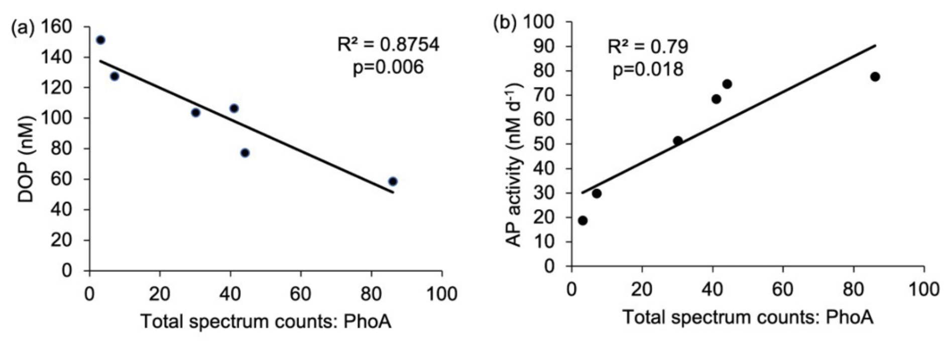 Figure 7Relationship between (a) Synechococcus PhoA (total spectral counts) and concentrations of DOP (nM) and (b) Synechococcus PhoA (total spectral counts) and alkaline phosphatase activity (AP, nM d−1). The R2 value and p-values are reported. p<0.05 indicates that the relationship is statistically significant.