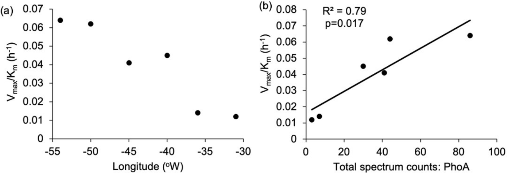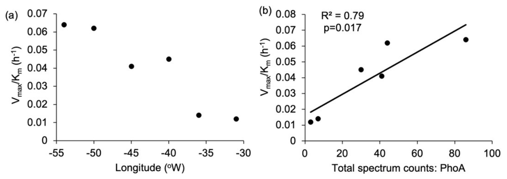 Figure 8Enzyme efficiency for alkaline phosphatase was calculated as the ratio between Vmax and Km (h−1); (a) zonal gradient in enzyme efficiency, indicating higher enzyme efficiency in the western compared to the eastern subtropical Atlantic and (b) positive significant (p= 0.017) relationship between Syn-PhoA and enzyme efficiency.
