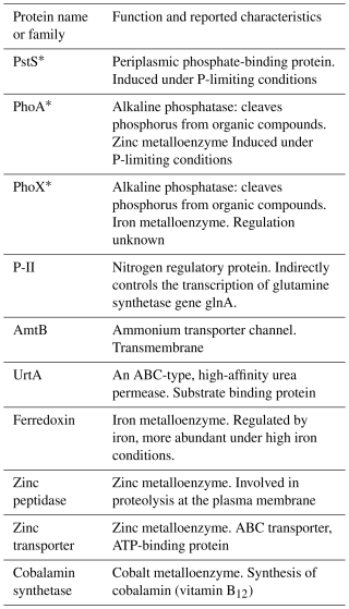 A small number of tryptic peptides were selected for absolute quantitative analysis in the samples from nutrient addition experiments (see Sect. 2.5 for details) and were analysed as described in detail by Held et al. (2026) (companion manuscript). The amino acid sequence for the protein biomarkers quantified in this study (PstS, PhoA, PhoX) for Prochlorococcus and Synechococcus are summarised in Table S3 and peptide report and analytical details are found in Supplement S3.