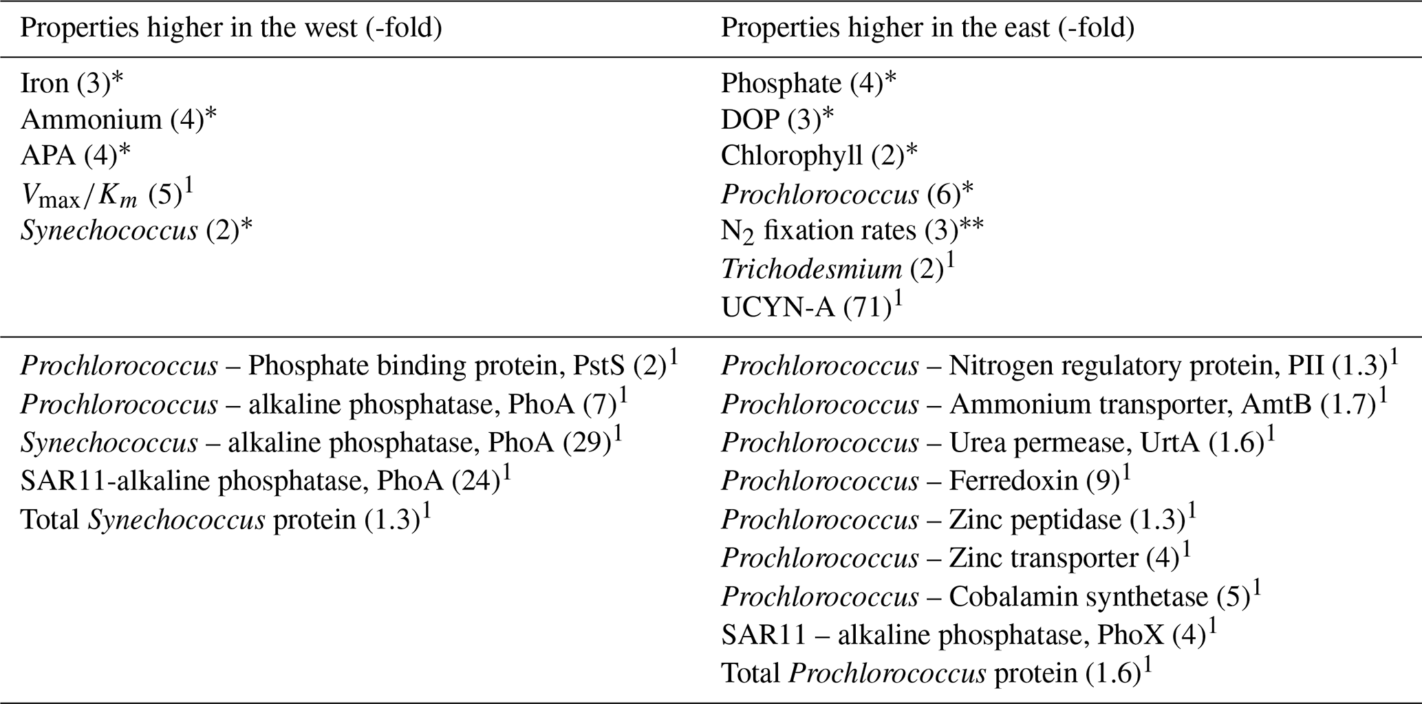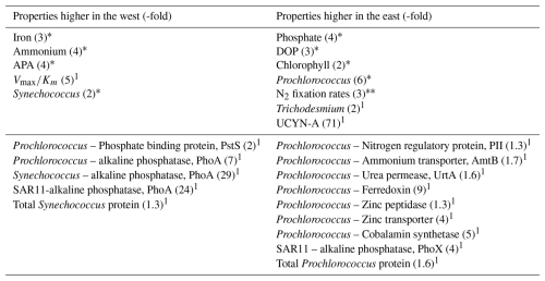 These zonal gradients in hydrography, nutrients, biological rates and picocyanobacteria create two contrasting regions – one in the west (west of 46° W or west of station 4) and one in the east (east of 46° W or east of station 4). Thus, quantitative comparisons of key characteristics can be drawn between station 2 at 54° W and station 7 at 31° E (Fig. 1a, Table 2). Compared to the east, conditions in the west were characterized by notably higher dissolved Fe and ammonium concentrations (3 to 4-fold higher), APA (4-fold higher) and Synechococcus abundance (2-fold higher). In contrast, the east was characterized by relatively high phosphate, DOP, chlorophyll a, Prochlorococcus abundance, rates of N2 fixation, Trichodesmium and UCYN-A abundances (Table 2).