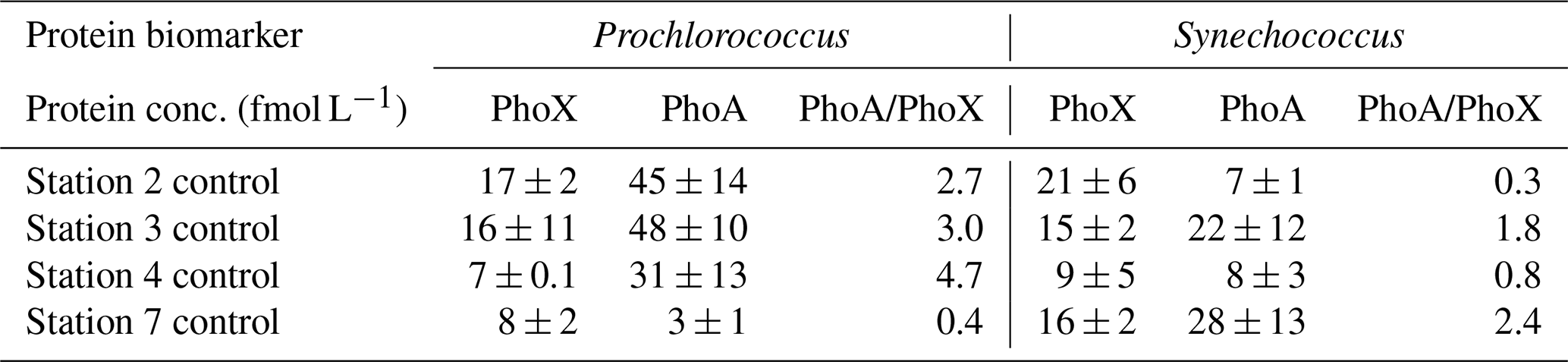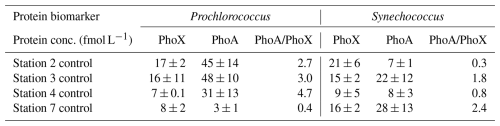 Table 3Concentration of proteins (fmol L−1) PhoX and PhoA for Prochlorococcus and Synechococcus at the start of the nutrient bioassay experiments at stations 2, 3, 4 and 7 (see Fig. 1a for locations) to illustrate how the relative concentration and ratio of PhoA to PhoX differ between Prochlorococcus and Synechococcus and across the zonal transect.